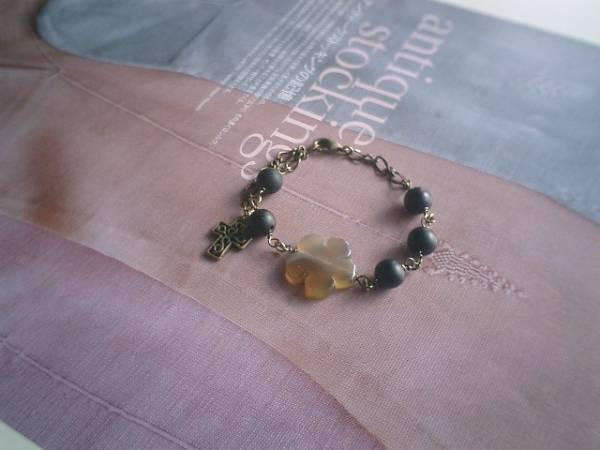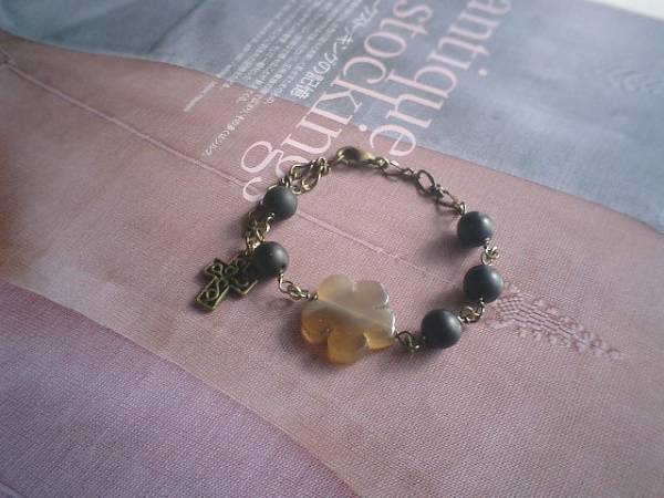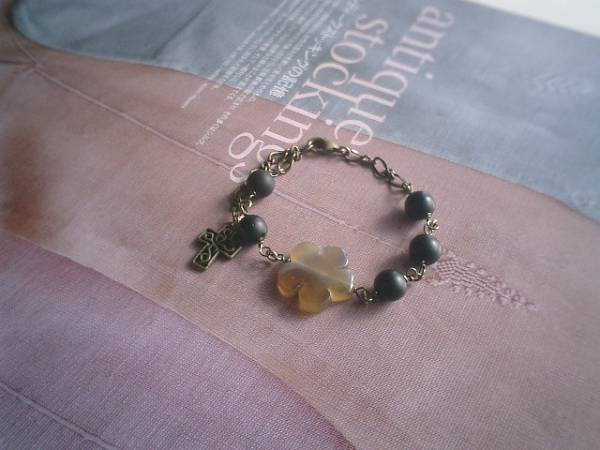 ネオ・ロマンチック・・シリーズです♪パリの路地裏・・シックなマットオニキスとモス・アゲートのお花のブレスレットです♪落ち着いたやさしい黒のオニキスに繊細なモス・アゲートのお花を合わせてアンティークな表情です♪オニキスは8ミリの丸玉、トップのお花は2センチ位です♪長さは全長23センチ位で調節自由です♪お揃いのネックレスも出品しています♪シンプルで飽きのこないいつまでも着けられるデザインを考えて作りました♪ハンドメイドをご理解頂いてノークレーム、ノーリターンでお願いします