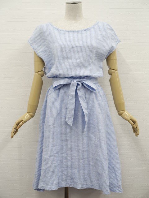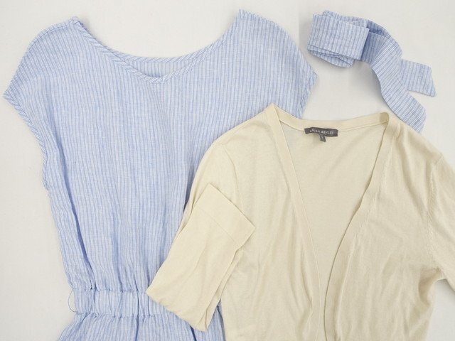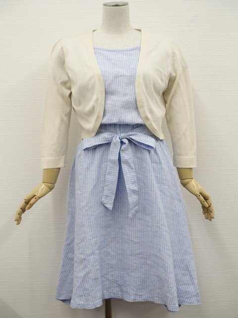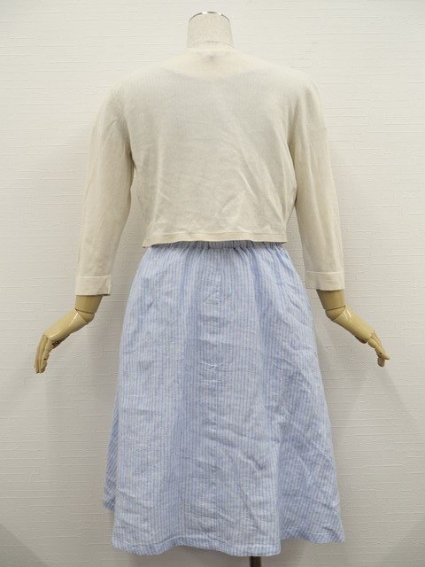 洗える7分袖ニットボレロ+半袖ひざ丈ワンピース コーディネート2点セット S相当 アイボリー/ライトブルー×ホワイト ストライプ柄 シンプル系 20代・30代~