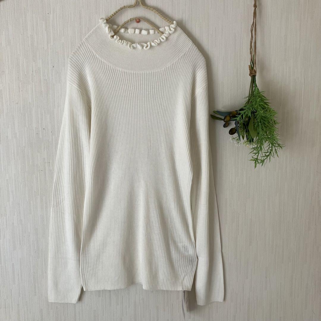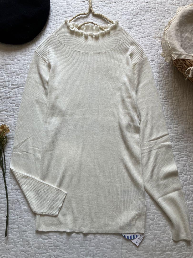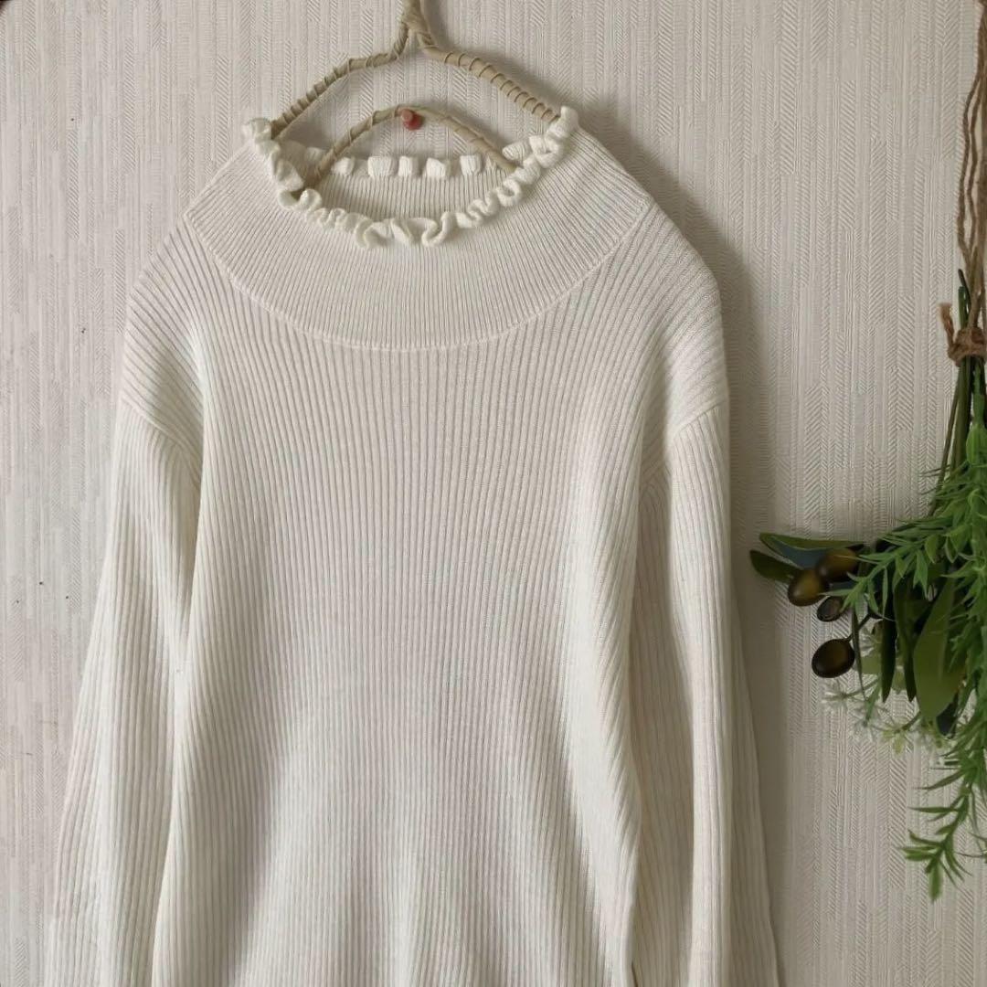 フリルを加えたタートルネックが上品で可愛らしいリブニット。