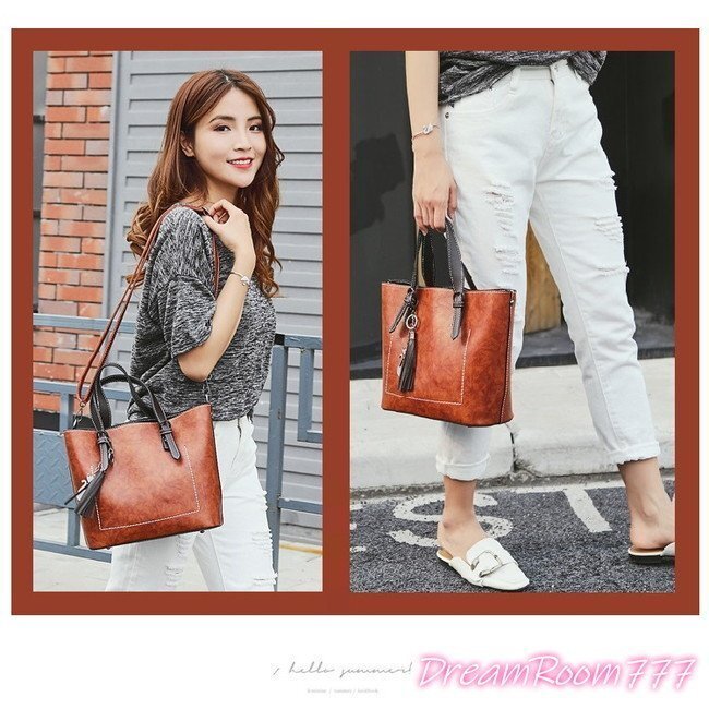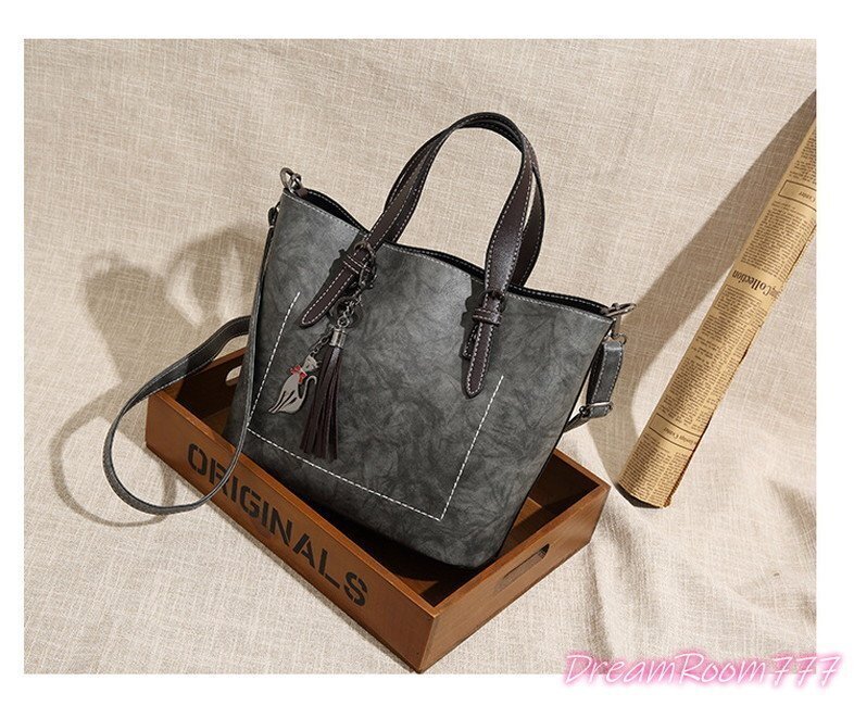 タッセルチャーム付き ミドル レザーバケツトートBAG【グレー】 ハンドバッグ ショルダーバッグ セレブ 合皮革 K-095-3
