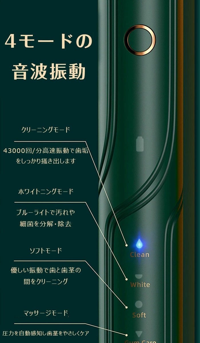 【 高性能の電動歯磨きモード4つ 】4段階の切替モードで振動速度を変え,音波式歯ブラシは、細かな振動を加えることで手磨きでは磨きにくい所もきれいにします。各種類の歯や歯ぐきの状態にちゃんと合わせ、お好みや歯科医の勧めに合わせて最適な歯磨きモードを選択することができます。