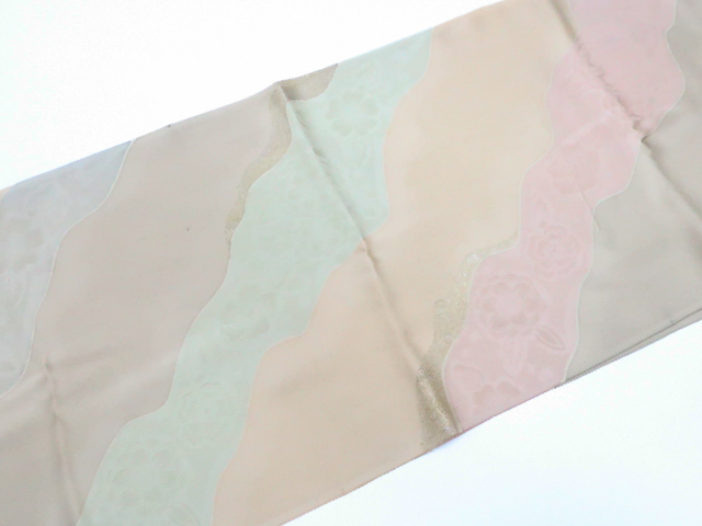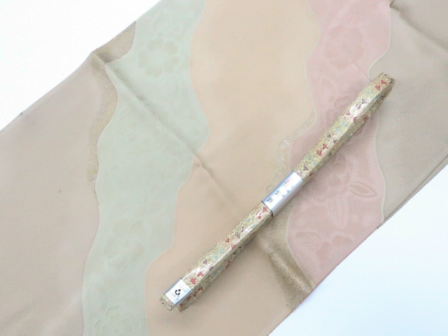 リサイクル商品の為、帯揚げに点しみがございますがご着用いただけると存じます。 地色はベージュ・金です。 1枚目の画像が近いお色かと思われます。 素材は正絹です。 |