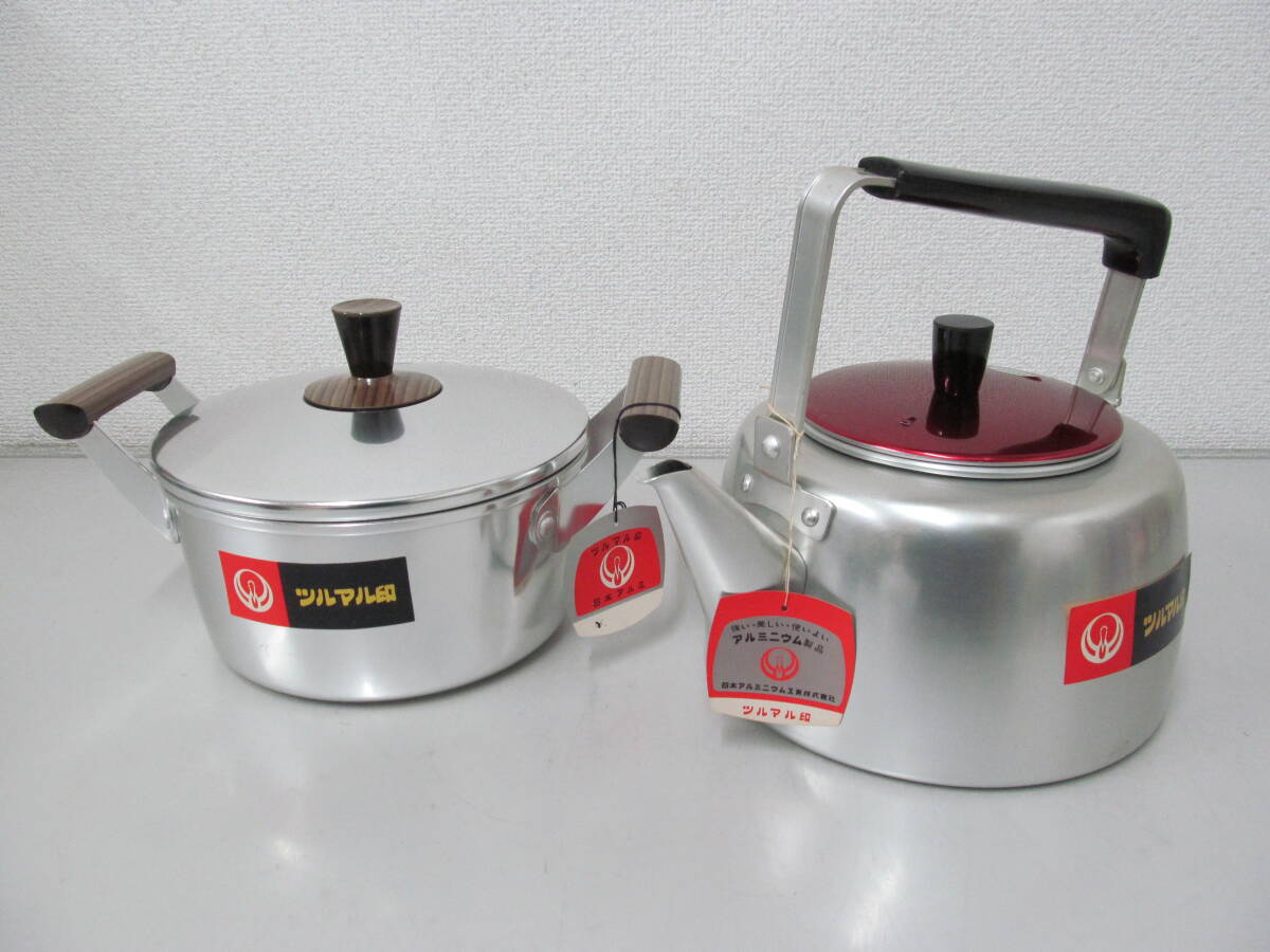 日本アルミ ツルマル印 アルミ ヤカン 湯沸かし ケトル 3L&両手鍋 2.1L 2点で 昭和レトロ 未使用、長期保管品