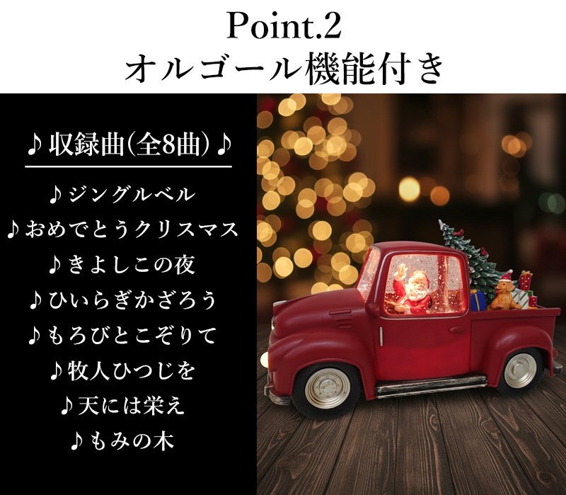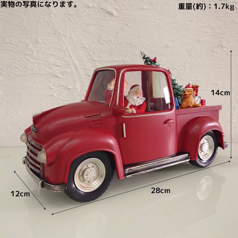 ![]() クリスマスの夜、プレゼントをいっぱい積んだサンタトラックが走り出す―― そんなワクワク感を閉じ込めた、レトロでかわいらしいスノードームライトです。 鮮やかなレッドカラーのヴィンテージトラックに、サンタクロースとクリスマスツリー、たくさんのギフトボックス。 ドームの中ではキラキラと雪が舞い、内蔵LEDライトが温かな光で幻想的な雰囲気を演出します。 インテリアライトとしても存在感抜群で、リビングや玄関、ツリーの足元などに飾るだけでお部屋が一気にホリデームードに。 大人も子どもも楽しめる、心温まるクリスマスインテリアです。 給電方法は2つ、付属のUSBコードで使用する他、 単三電池3本でコードレスとしての使用も可能! 精巧に作られている為、ライトを点灯させずに 単体でオブジェとして使用しても存在感抜群です! ギフトなどにもおすすめです! ●動作パターン● ・未点灯 ・LED点灯(音楽なし) ・LED点灯(音楽あり) ※乾電池、USB出力用のアダプターは付属しておりません。 点灯時の様子は動画でご覧くださいませ。 動画はこちら ↓↓↓↓↓↓↓↓↓↓↓↓↓ こちらをクリック! カラー:レッド サイズ(約): 高さ14cm×幅28cm×奥行き12cm コード長さ(約):98cm 重量(約):1.7kg 素材:プラスチック 【給電方法】 単三電池×3/USBコード |