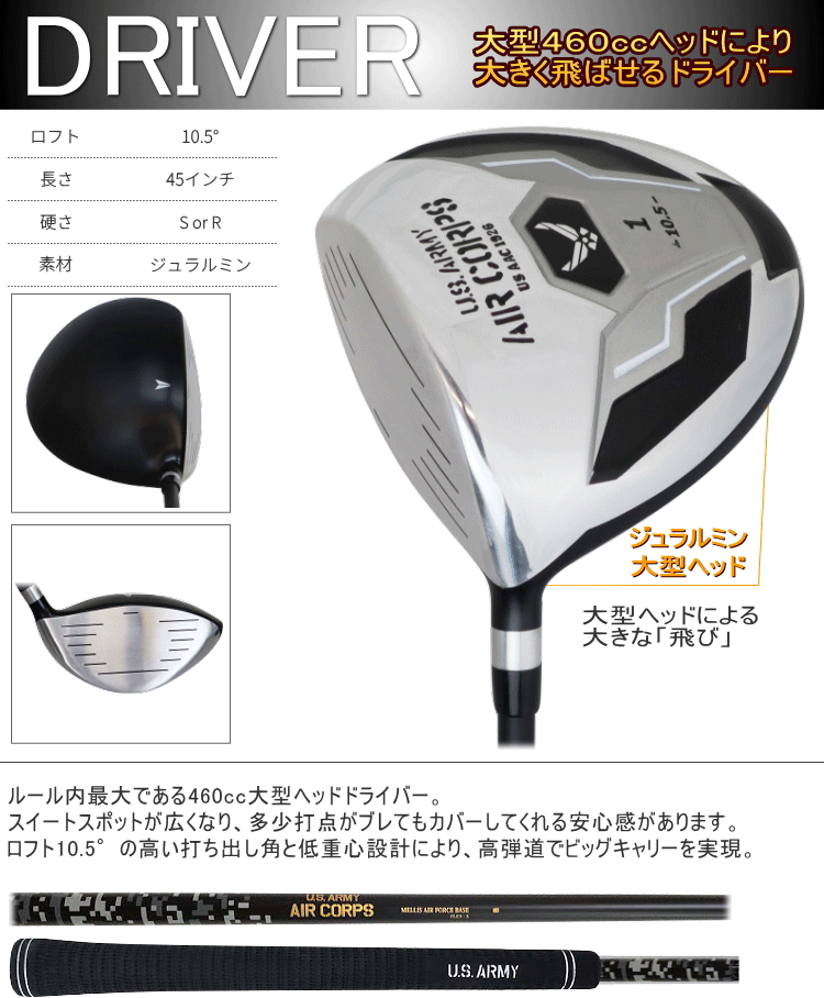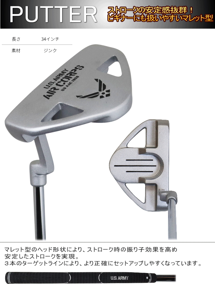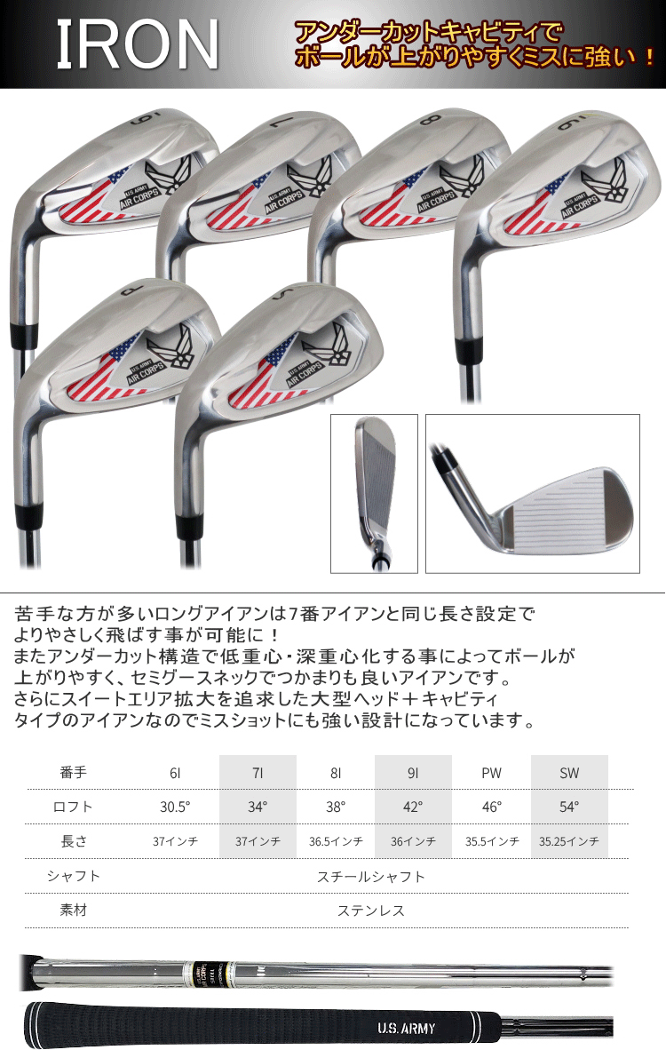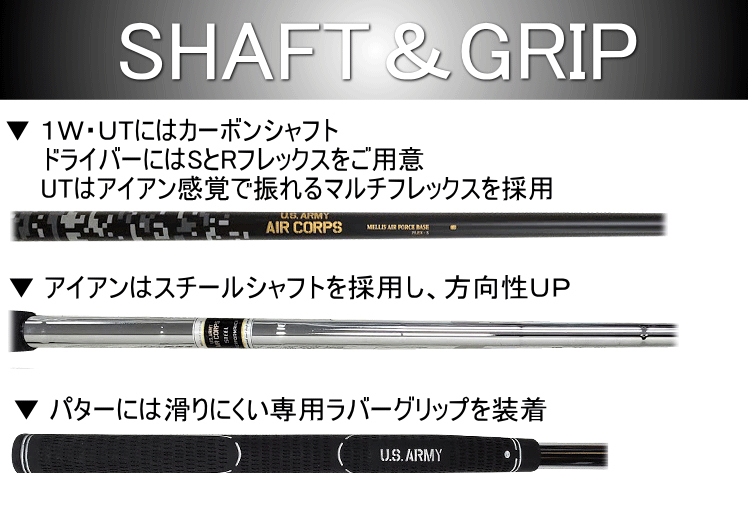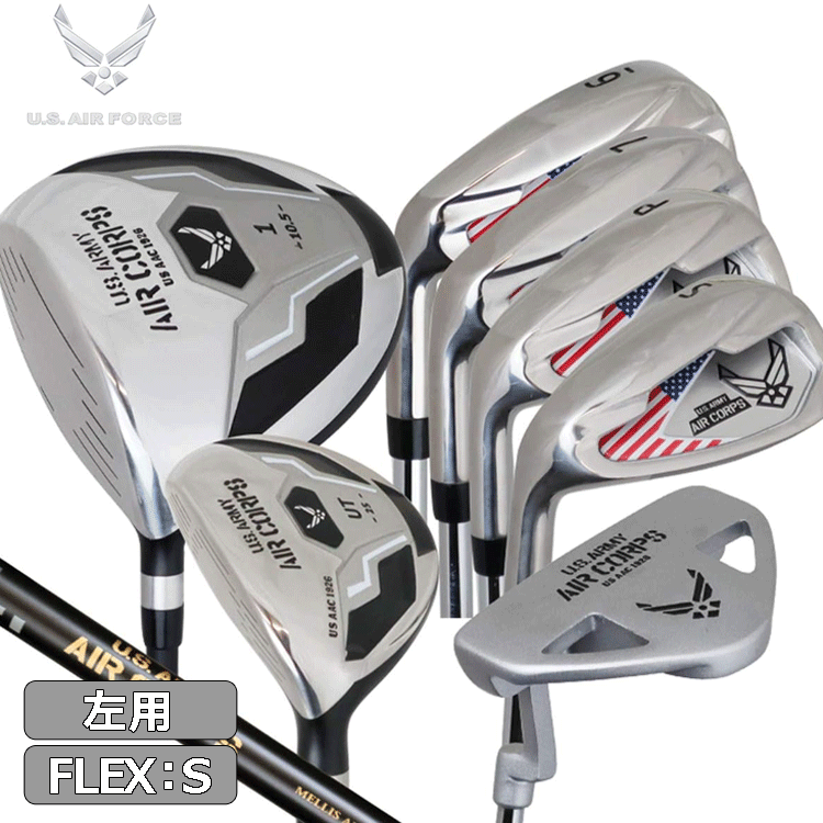 【商品特徴】 <US ARMY AIR CORPSのレフティセットが新登場> 日本でも根強いファンを持つ、アーミーシリーズ。AIR CORPS空軍をモチーフにしたクラブセットとなります。 デザインだけではなく、機能性にもこだわった一品です。 ユーティリティとロングアイアンを7番アイアンと同じ長さにするセミレングスを採用。 一般的に長いクラブは難しく感じてしまい、苦手な方が多いですが、セミレングスにすることで、7番アイアンと同じような感覚でスイングでき、 よりやさしく飛ばすことができます。 ビギナーから、久しぶりにゴルフを再開される方など、満足していただける仕上がりになっております。 【商品詳細】 ●状態:新品・未使用品 ●レフティーモデル(左用・左打ち用) ●セット内容:1W、UT、6I、7I、8I、9I、PW、SW、PT(9本セット)、ヘッドカバー3点(1W用,UT用,PT用) ●シャフト:1W、UT/オリジナルカーボンシャフト 6I、7I、8I、9I、PW、SW、PT/オリジナルスチールシャフト ●シャフトフレックス:S(ドライバーのみ選択可能) ※ユーティリティは、マルチフレックス ※アイアンは、SR相当となります。 ●グリップ:オリジナルグリップ ※ゴルフクラブのセットとなり、キャディバッグは付属しません。 ※撮影時の光量の具合や、ご覧いただいております画面環境によりまして、実際の商品と若干色味が違う場合がございます。 ※商品詳細のスペック値はメーカー表記の数値となりますが、個体差による若干の公差がございます。