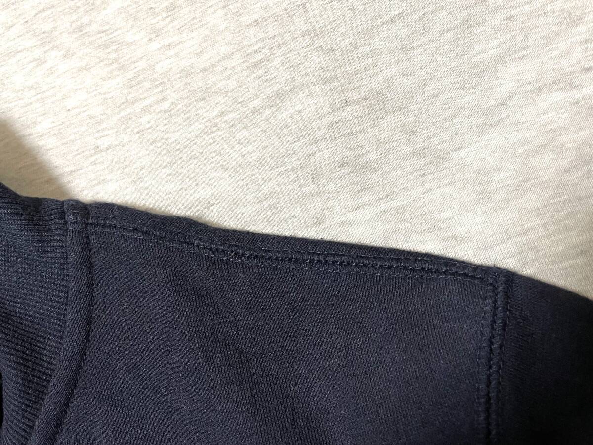 本体に使われているスウェット生地は紺色で、使われているリブも紺色、内側の後ろ身頃襟下部分に張られているボーダーの生地部分は紺色ベースに、ヘザーグレーと言った感じの杢感あるグレーのボーダーが織り込まれています。