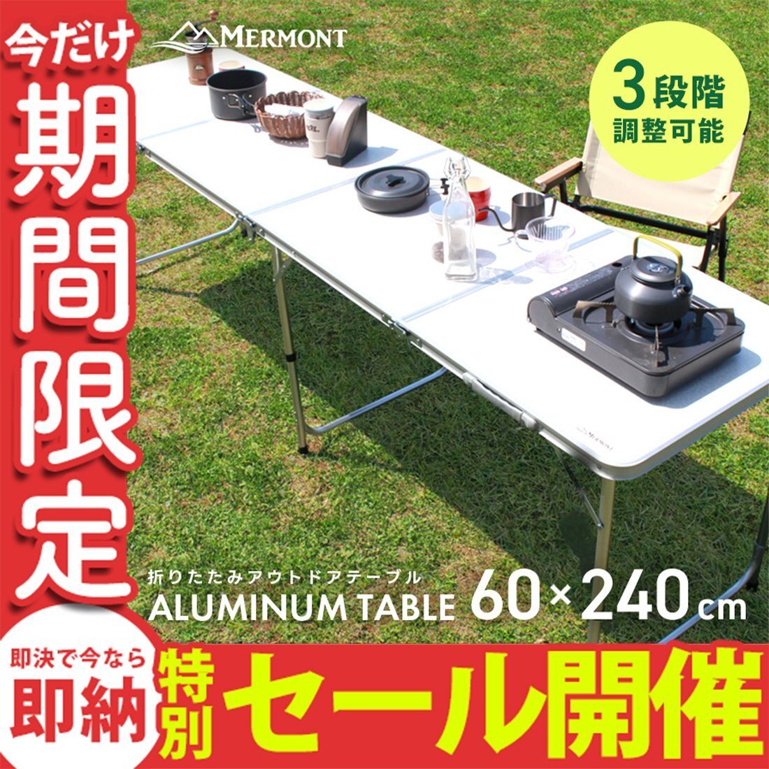 | かんたん組立の折りたたみアウトドアテーブルです。 広々サイズの240cm×60cm!! サビに強いアルミを使用! 天板には防水加工が施されています。 必要のない時は折りたたんで収納できる!! 取っ手付きで持ち運びもラクラク♪ 高さは「ハイスタイル」「ミドルスタイル」「ロースタイル」の3段階調節。 お好みや用途に合わせて使い分けることができる嬉しい仕様♪ キャンプ、バーベキュー、お花見などにとても便利! 【商品仕様】 カラー:ホワイト テーブルサイズ(約):幅240cm×奥行60cm×高さ55cm/62cm/70cm(※高さ3段階調節) 収納サイズ(約):60cm×60cm×13cm 耐荷重(約):30kg 重量(約):9.5kg 材質:アルミニウム 他 【注意事項】 海外製品で簡易梱包での輸入のため風防に擦れや多少の小キズなどがある場合がございますが、商品自体には問題ありませんのでご了承下さい。 |