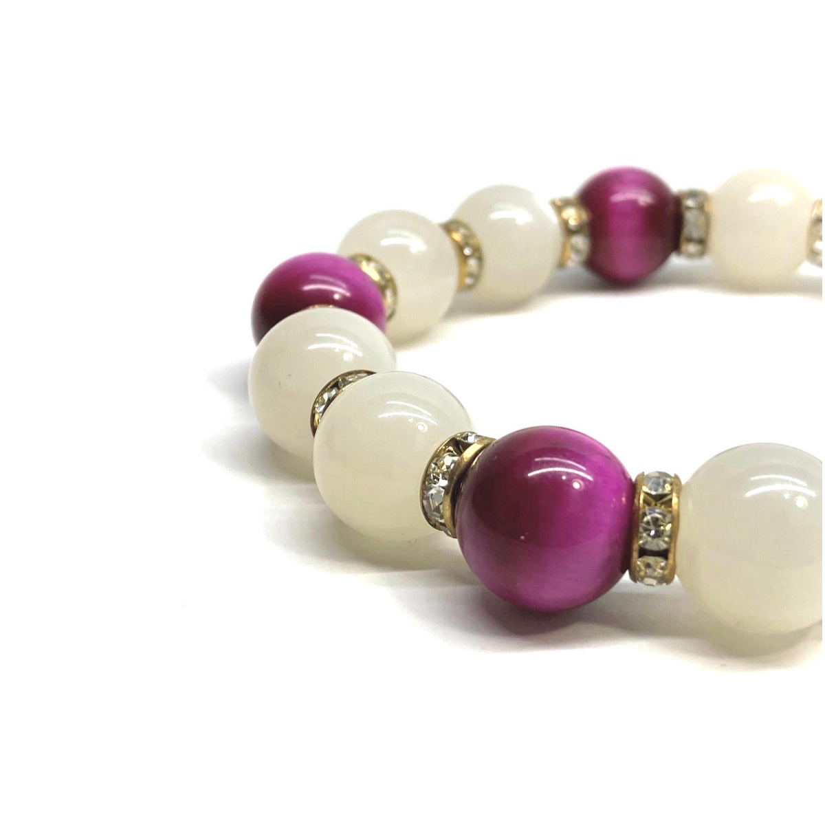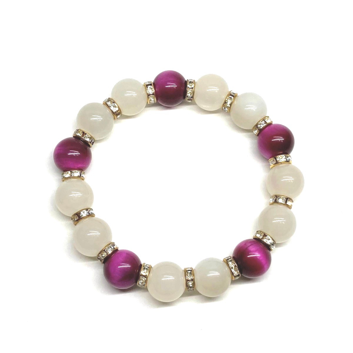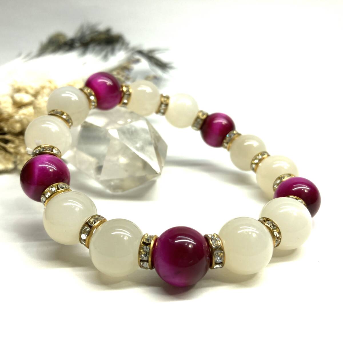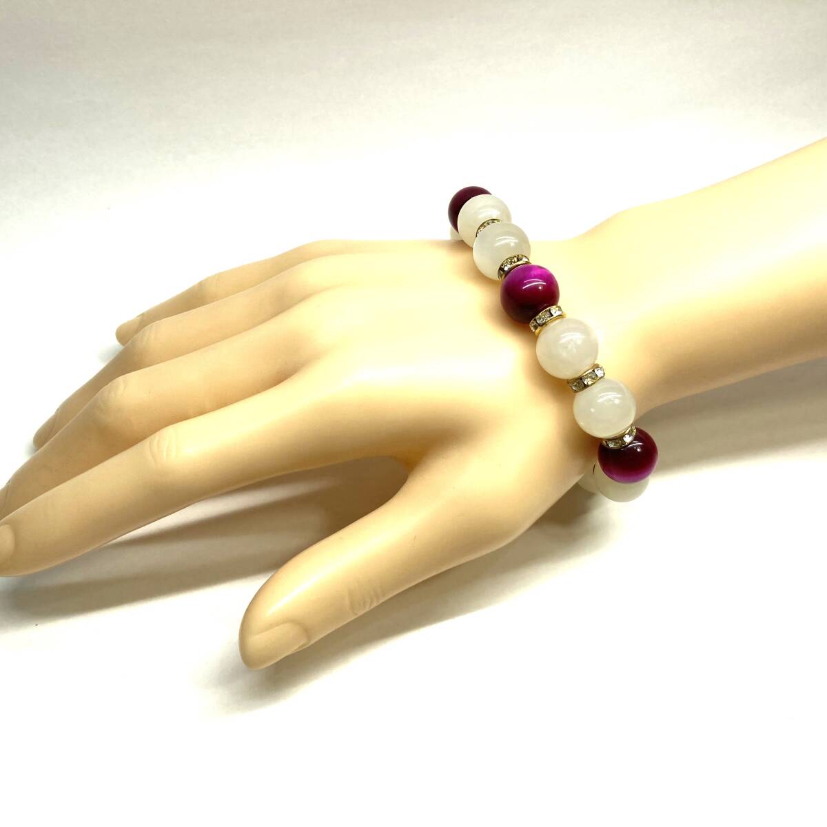 こちらは、ムーンストーンとピンクタイガーアイを組み合わせたパワーストーンブレスレットです。間にはロンデルを挟み高級感あるデザインに仕上げております。程よくインパクトがある12mm玉を使用して内周約18cmです。(サイズ変更の場合は取引ナビにてご連絡をお願いします。) 数に限りがございますので気になる方はお早めにどうぞ。