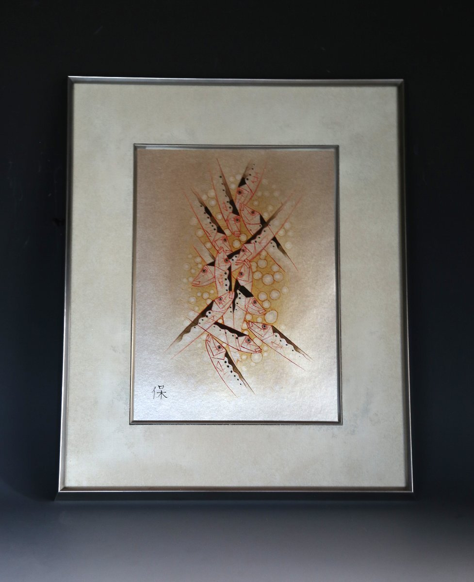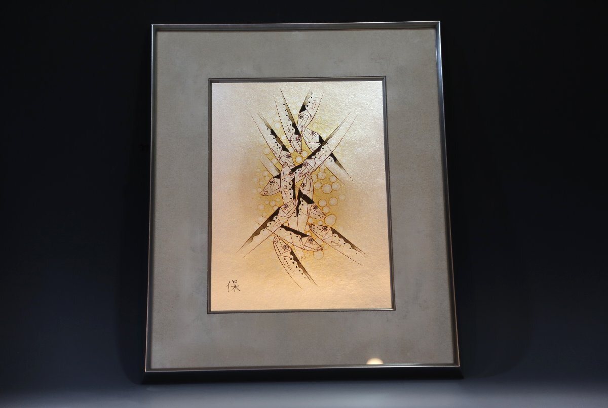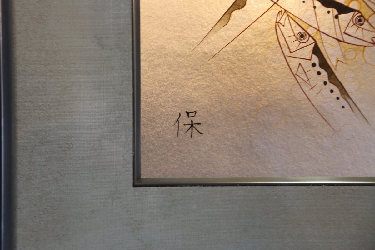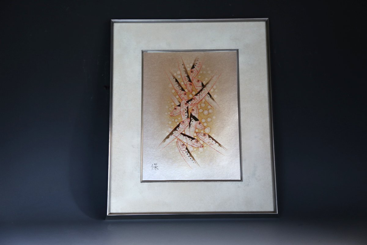 尾長保:漆芸家、日展特別会員。 昭和7年氷見市生まれ。蒔絵の山崎立山、文化勲章の佐治賢使に師事。 日展特選北斗賞、菊花賞、審査員4回、参与を経て、改組後は平成27年会員賞受賞。 現代工芸展と新工芸展で文部大臣賞、審査員も務める。 日工会展では総理大臣賞を2回受賞。平成12年文部大臣地域文化功労者表彰。 居酒屋、寿司屋、海の近くの旅館などのディスプレイにいかがでしょうか? 中枠のマットに経年の荒れを感じますが状態良好です。縦50.5cm、横41.5cm。ノークレーム、ノーリターンでお願い致します。この他にも出品しておりますのでご覧下さい。ここをクリック