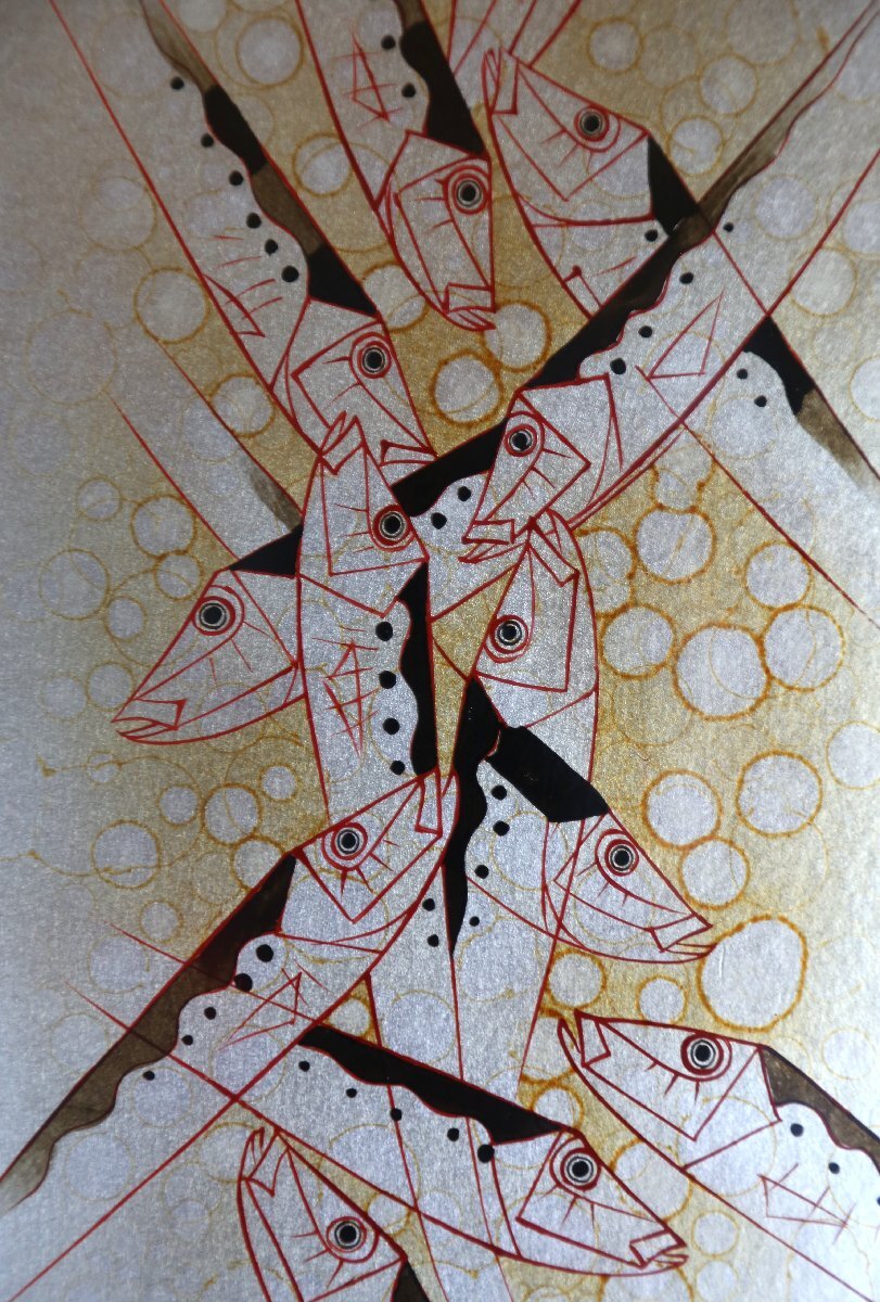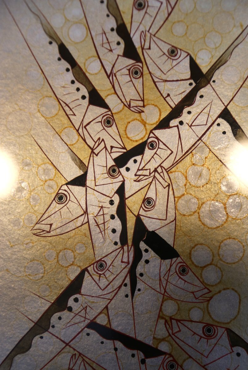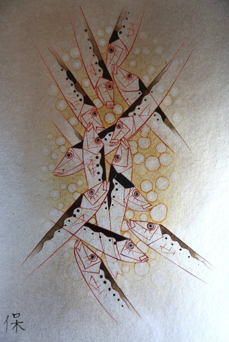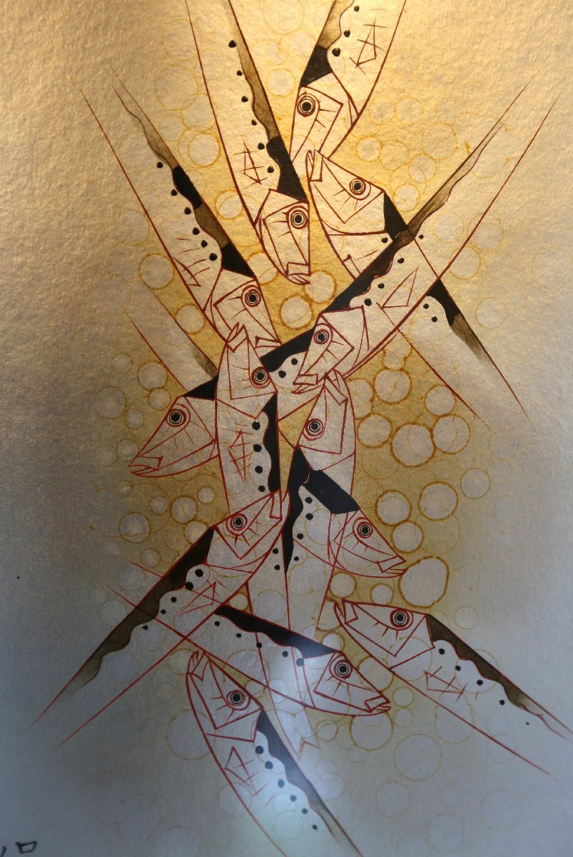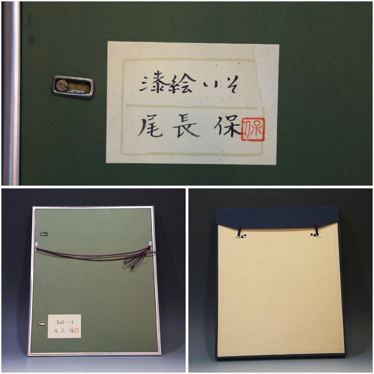 尾長保:漆芸家、日展特別会員。 昭和7年氷見市生まれ。蒔絵の山崎立山、文化勲章の佐治賢使に師事。 日展特選北斗賞、菊花賞、審査員4回、参与を経て、改組後は平成27年会員賞受賞。 現代工芸展と新工芸展で文部大臣賞、審査員も務める。 日工会展では総理大臣賞を2回受賞。平成12年文部大臣地域文化功労者表彰。 居酒屋、寿司屋、海の近くの旅館などのディスプレイにいかがでしょうか? 中枠のマットに経年の荒れを感じますが状態良好です。縦50.5cm、横41.5cm。ノークレーム、ノーリターンでお願い致します。この他にも出品しておりますのでご覧下さい。ここをクリック