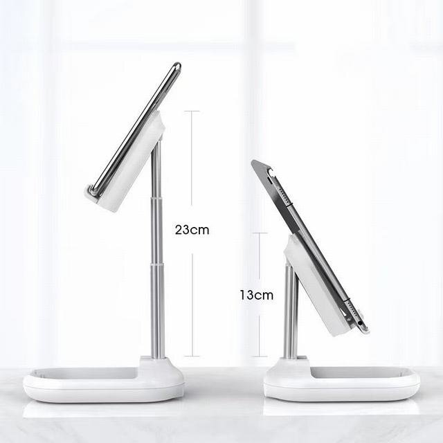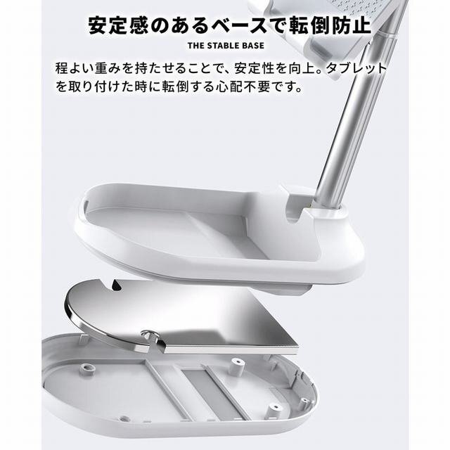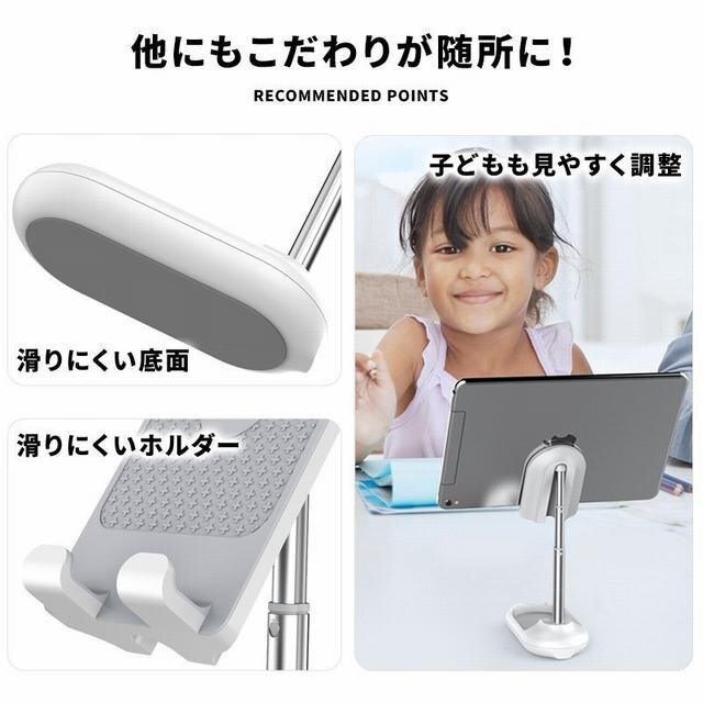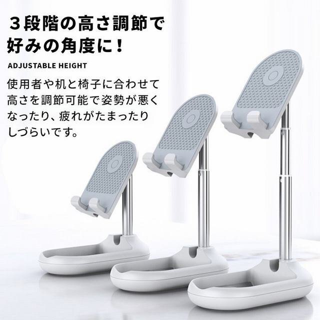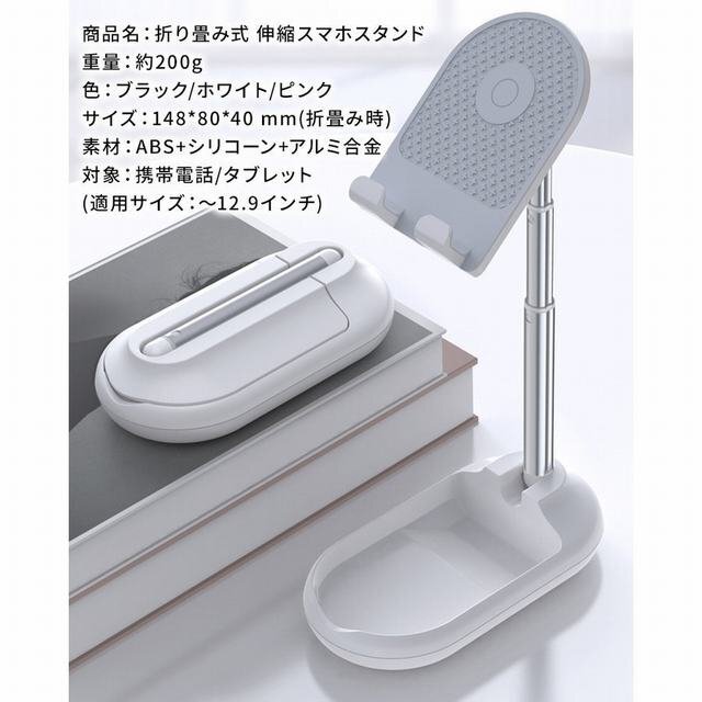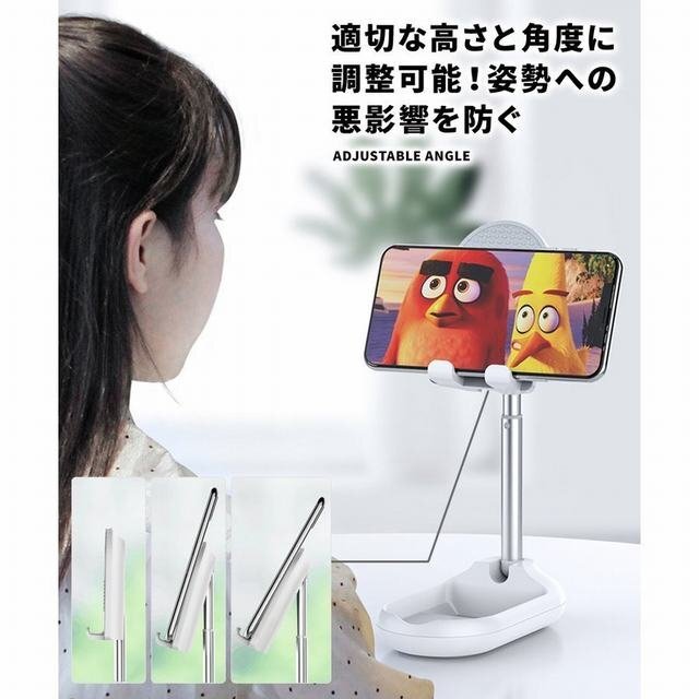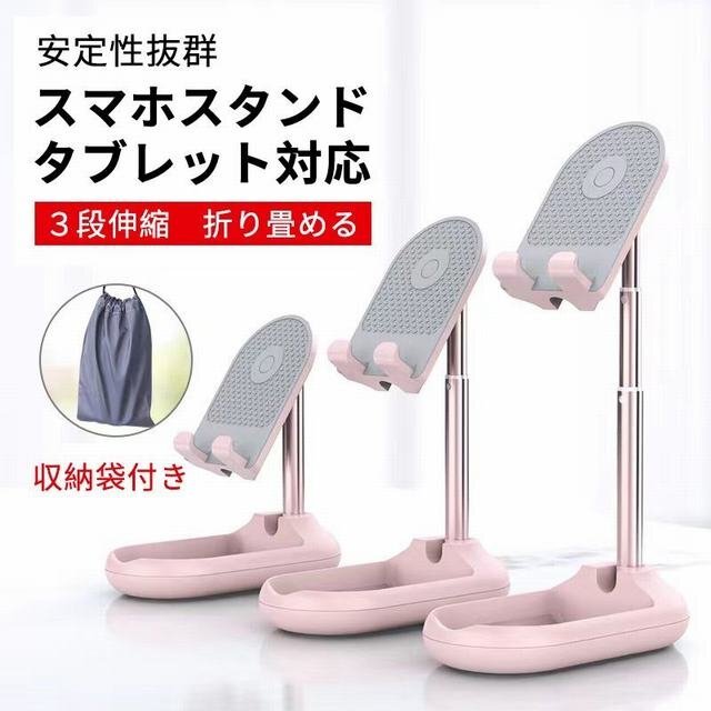 折り畳み式のおしゃれで可愛いスタンド。 コンパクトでフラットなデザインなのでカバンに入れても邪魔にならず持ち運び用としても便利。 アームを伸ばし、展開するだけで簡単に使用できます。 アームで3段階の高さに調節可能。 角度も約90度の調節ができるので動画視聴時等の姿勢が気になる方にもオススメです。