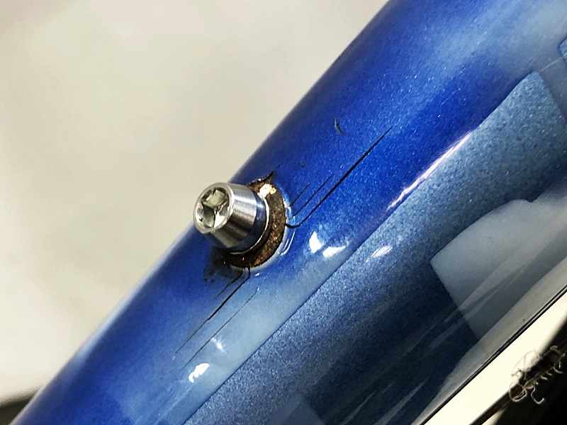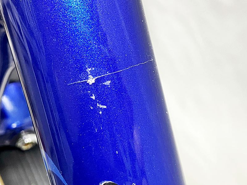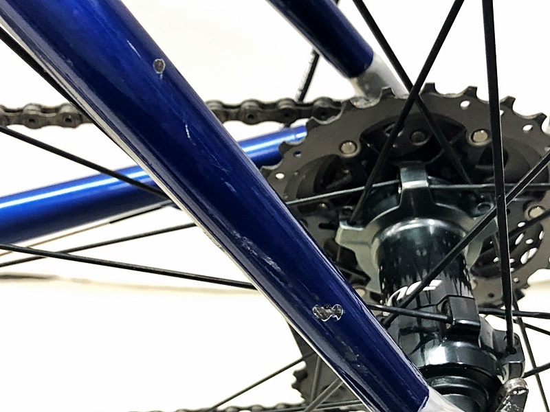 フレーム、その他外観:訳アリの理由は、ダウンチューブケージ台座付近、シートチューブにクラックの疑いがあるキズがあること、フォーク、フレーム、パーツ全般に傷や擦れ傷、多数の塗装ハゲ、汚れやサビがあり、傷みが目立つため訳アリの現状お渡し車体となります。