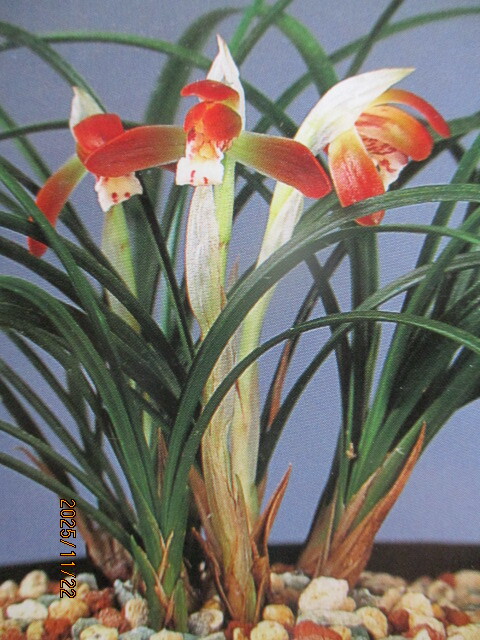 ★日本春蘭【 花芽付株 = 天 恵 (てんけい) = 】◆整型小型弁濃色紅美麗花『 上木 7本:最長葉25㎝ 』人気優秀品◆寒蘭/雪割草/野生蘭