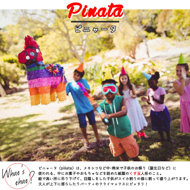 | 仕様 | Pinata(ピニャータ)はメキシコや南米のキッズ・パーティに欠かせないくす玉。 誕生日やハロウィン・クリスマスなどに必須!! おもちゃやお菓子を仕込んで吊り下げ スイカ割りのように子供たちが順番に目隠をし、 くるくると回ってから周りの声を頼りにピニャータを叩き壊します。 中からおもちゃやお菓子が飛び出しみんなで一斉に拾います。 子供達は大喜び! 紐を1本づつ引いて、穴を開ける事も出来ます。大人の方がピニャータを上下や左右に揺らして割りにくくしたり、 みんなでパーティを盛大にお祝いましょう! |