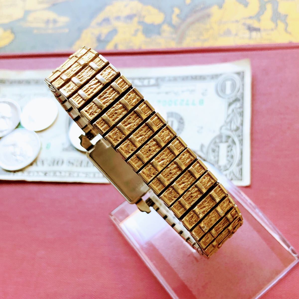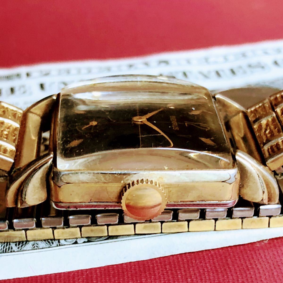 リューズを仕舞ってネジを巻こうとすると針が動いてしまいますが、ブラックフェイスに、金メッキのケース&ベルトがとても高級感があってお洒落なので、修理調整してお使いください。
