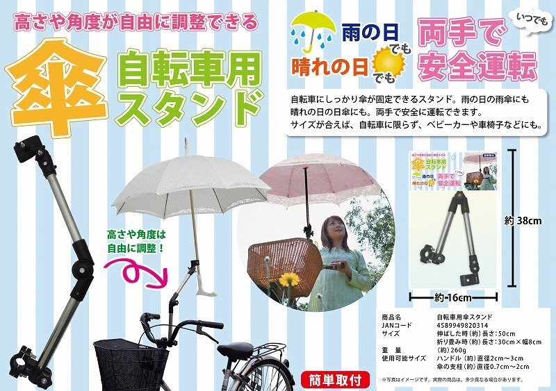 ●商品名:自転車用傘スタンド ●サイズ:伸ばした時(約)長さ:50 cm ●折り畳み時(約)長さ:30cm×幅8 cm ●重量:(約)260g ●使用可能サイズ:ハンドル(約)直径2 cm~3 cm 傘の支柱(約)直径0.7cm~2 cm ※簡易包装の為、パッケージおよび取扱説明書はございません。 ●注意事項: ※強風、大雨時のご使用はお控えください。 また、使用しない時も手巻きのボルトを全てきつめにお締め下さい。 ※道交法等につきましては各自治体によって異なりますのでご確認の上、ご購入くださいませ。 ※事故について弊社の責任や保証等は一切ございませんのでご理解の上ご購入ください。 |