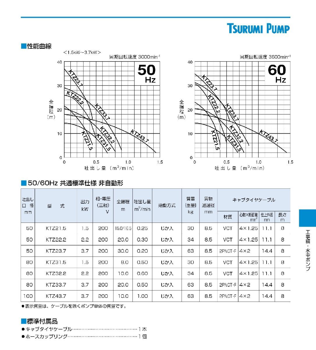 〈ツルミ〉KTZ43.7 60Hz 西日本用 一般工事排水用 水中ポンプ KTZ型 非自動形 口径100mm 出力3.7kW ツルミポンプ 代引不可