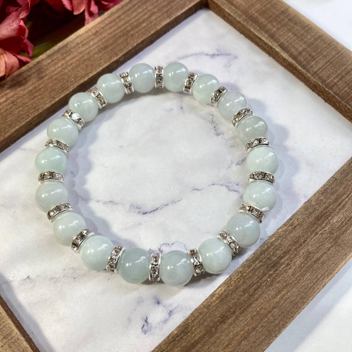 こちらは、10mm玉のビルマ翡翠を使用したパワーストーンブレスレットです。間にはロンデルを挟み高級感あるブレスレットに仕上げています。石大きさは腕にも馴染みやすいように10mm玉を使用して、サイズは内径約18cmです。(サイズ調節も無料で承っています。サイズ変更の場合は落札後、取引ナビにてご一報くださいませ。) 数に限りがございますので気になる方はお早めにどうぞ。