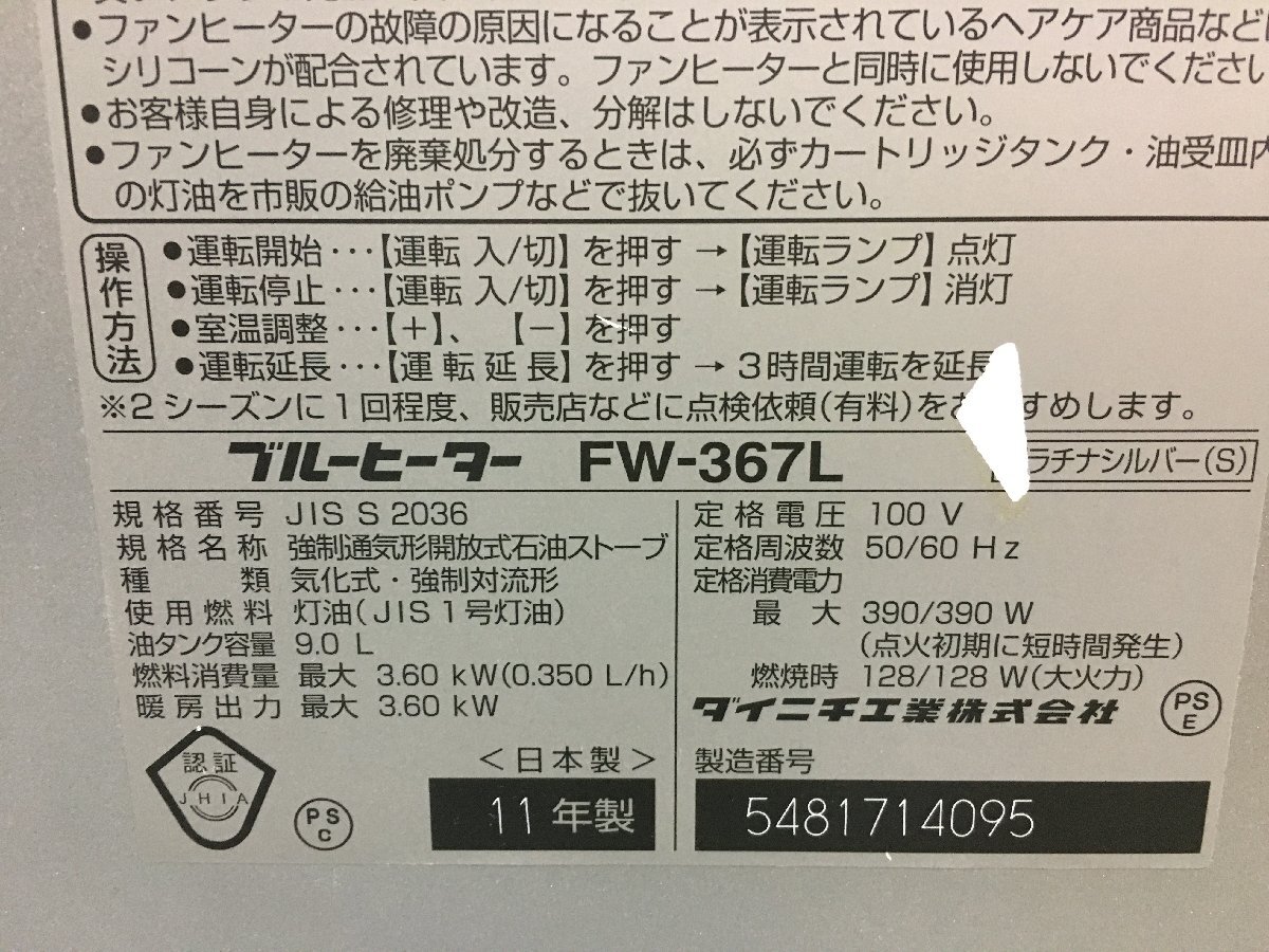 A4740 DAINICHI ダイニチ 石油ファンヒーター ブルーヒーター FW-367L 2011年製 9Lタンク 暖房機器