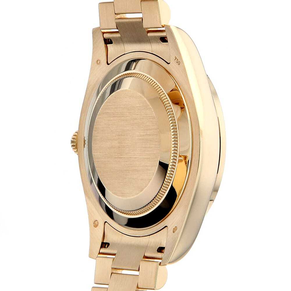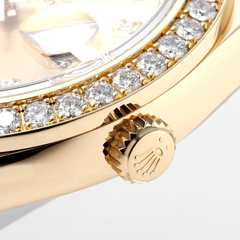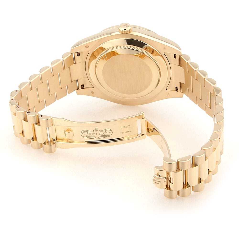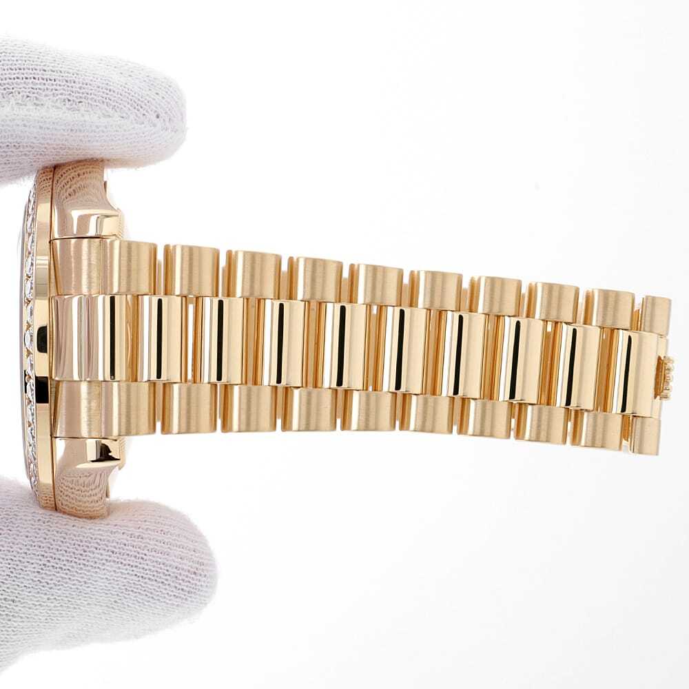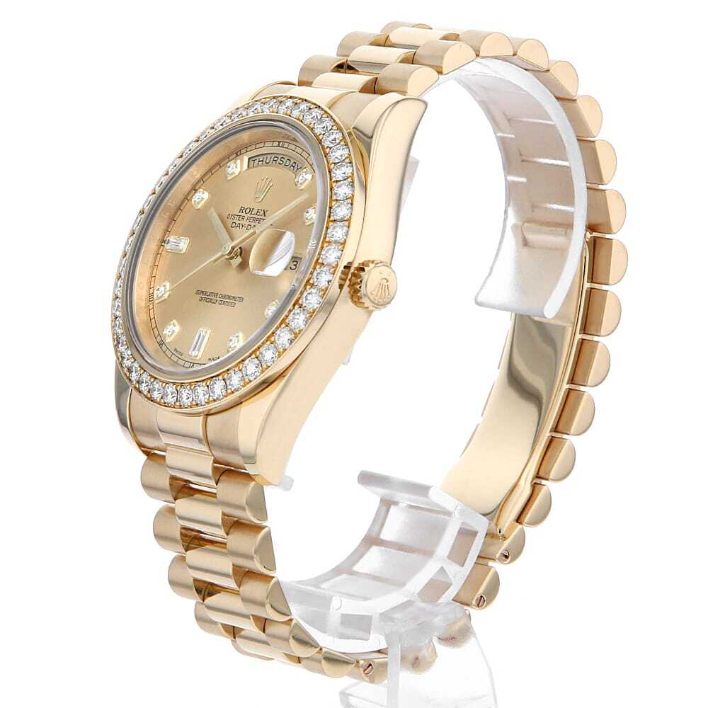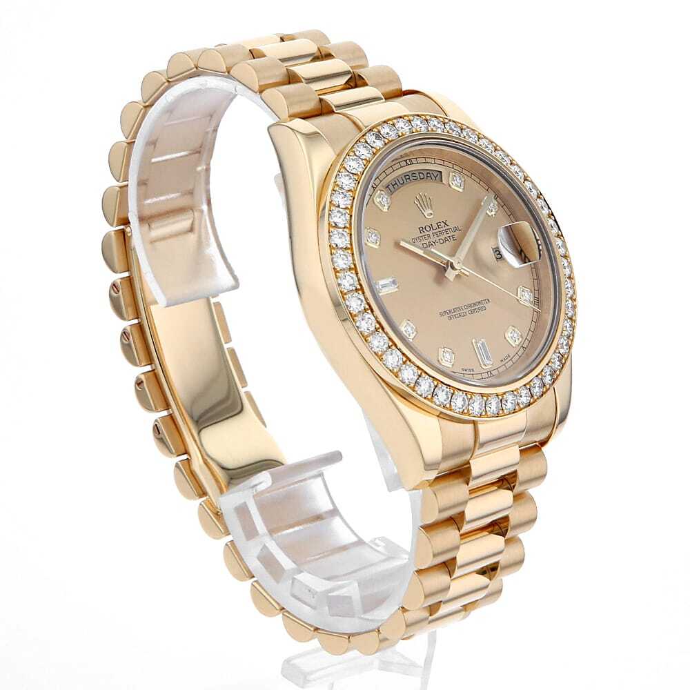| モデル情報 | ケース径を36mmから41mmへと大型化させ、デイデイトの新たなバリエーションとして登場したデイデイトII。ロレックスの威信を懸けただけにその完成度は群を抜いて おり、「富と成功の証」とも言われています。圧倒的な大振りケースと、腕にはめた時にズシリと感じる重量感は着け応えがあり、迫力ある存在感が魅力的です。またこちらはイエローゴールドにインデックスとベゼルにもダイヤを配し、さらにゴージャス感溢れるモデルです。 |
