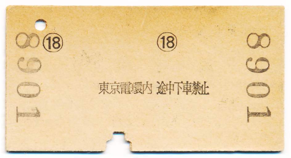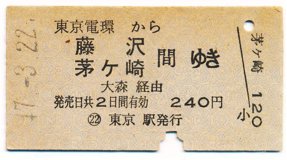 国鉄東海道本線 東京駅発行 一般式常備片道乗車券 東京電環から 藤沢、茅ヶ崎間ゆき です。