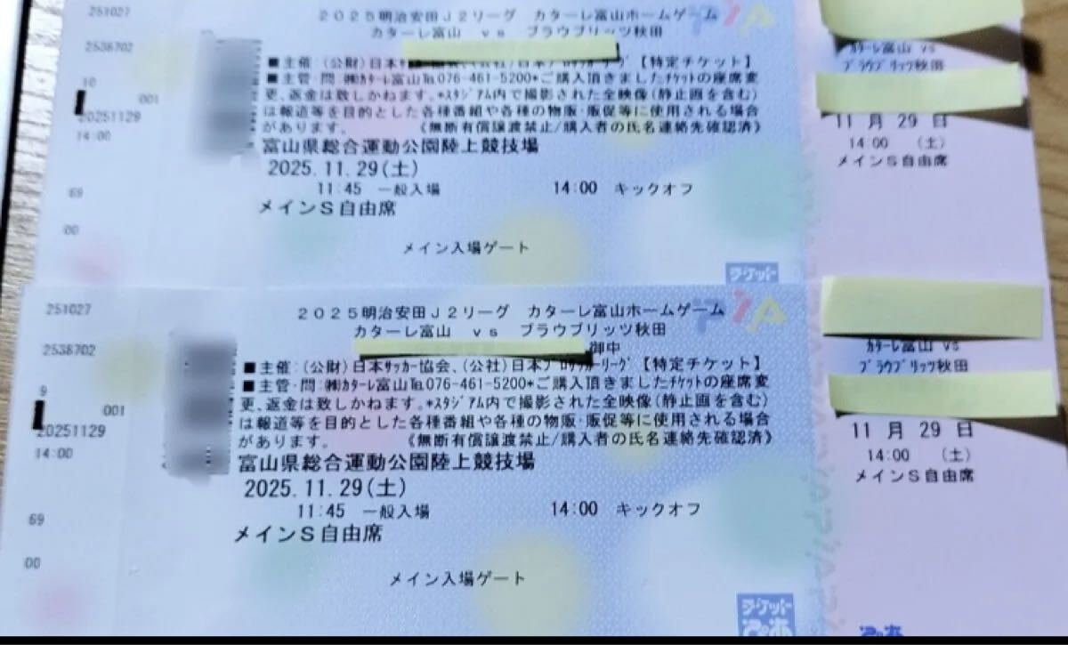 2025明治安田J2リーグ カターレ富山ホームゲーム カターレ富山vsブラウブリッツ秋田のメインS自由席チケット2枚です。
