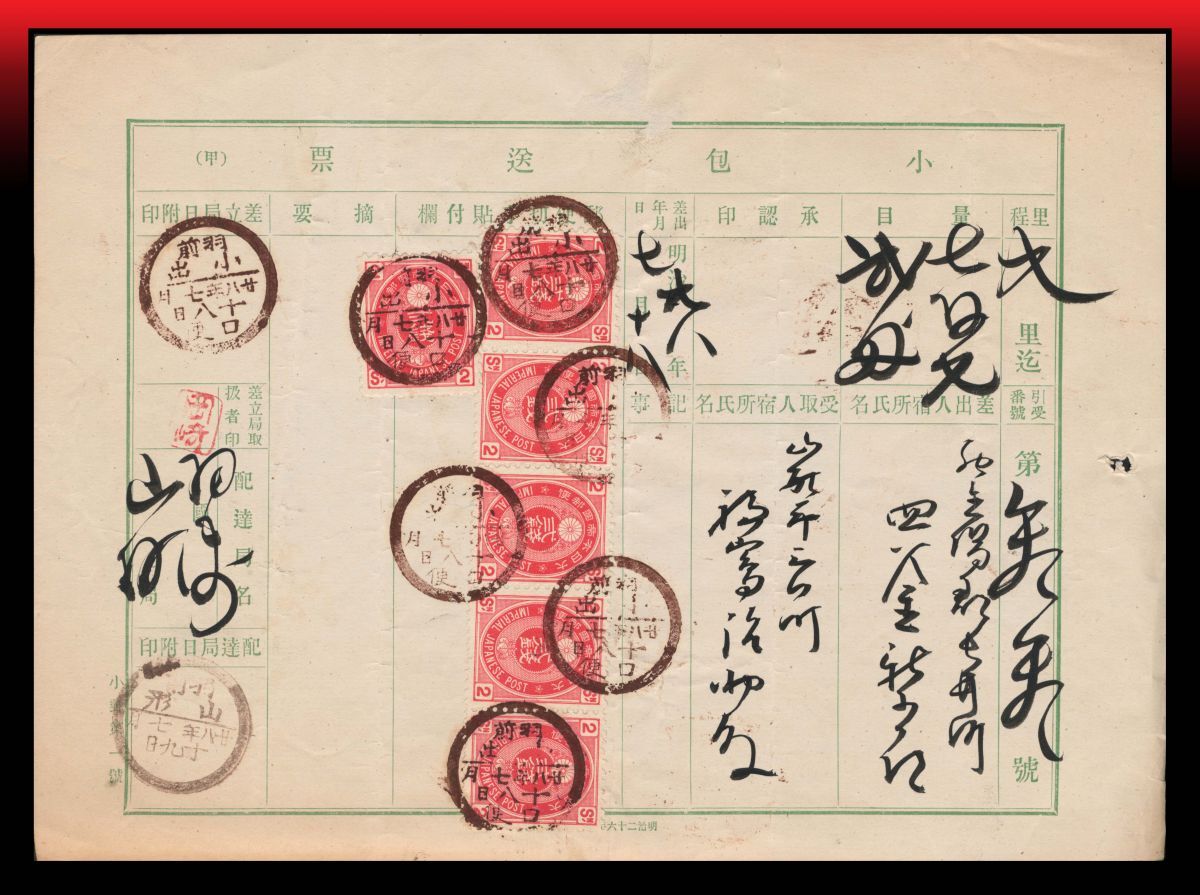 Z6 小包送票|U小判2銭6枚/小包送票 丸一型印:羽前/小出/廿八年七月十八日/ロ便 配達局印有り 折スジで折畳み定形送付 小包料金資料