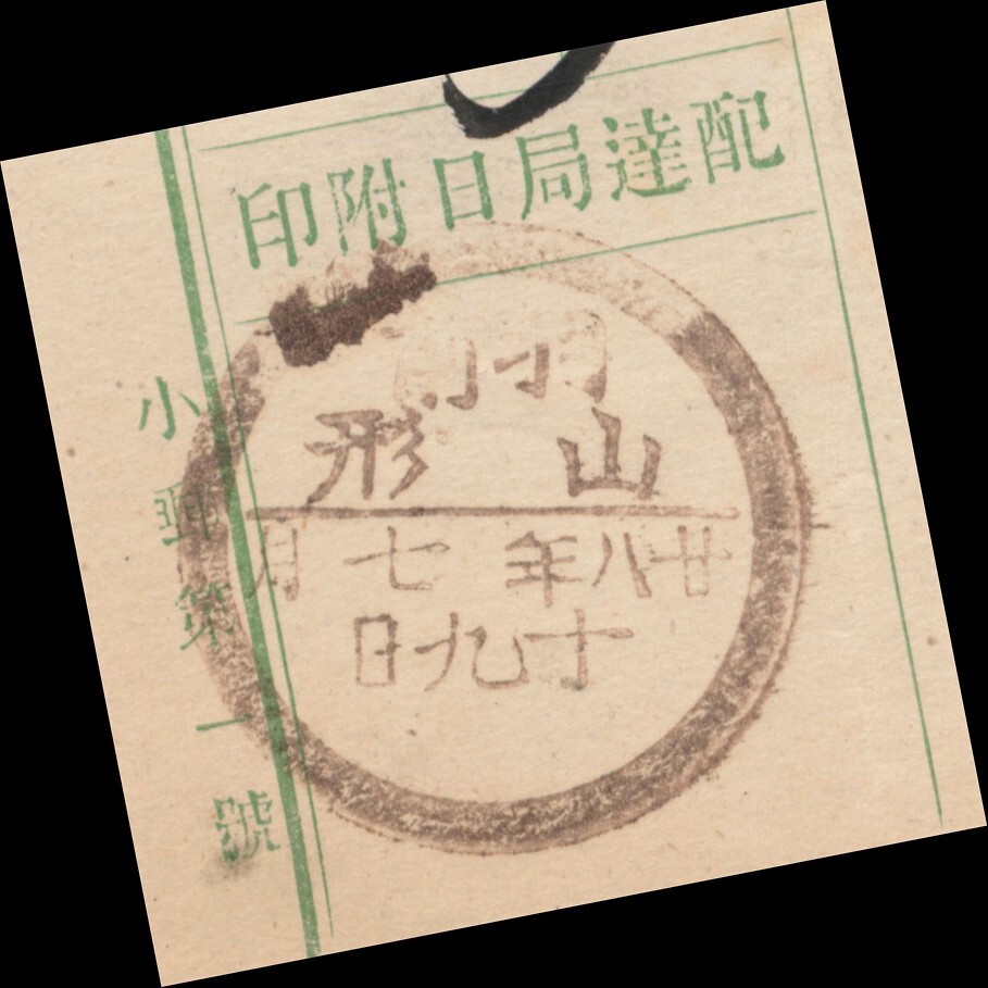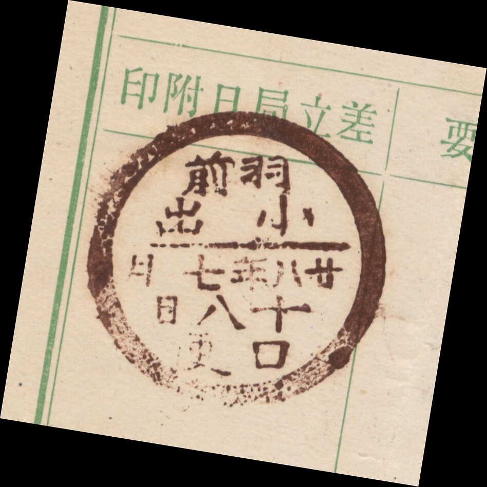 ●小包送票|U小判2銭6枚/小包送票 丸一型印:羽前/小出/廿八年七月十八日/ロ便 配達局印有り 折スジで折畳み定形送付 小包料金資料