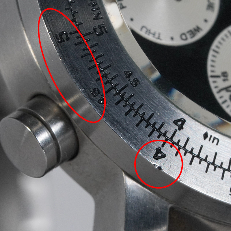 風防を含む全体に傷や汚れがあり、針にも汚れが見受けられます。 デイトの切り替えが1時間程遅れております。 ベルトは社外品と思われ、若干の使用感がございます。 稼働品になりますが、右下のボタンが反応しません。 | |||