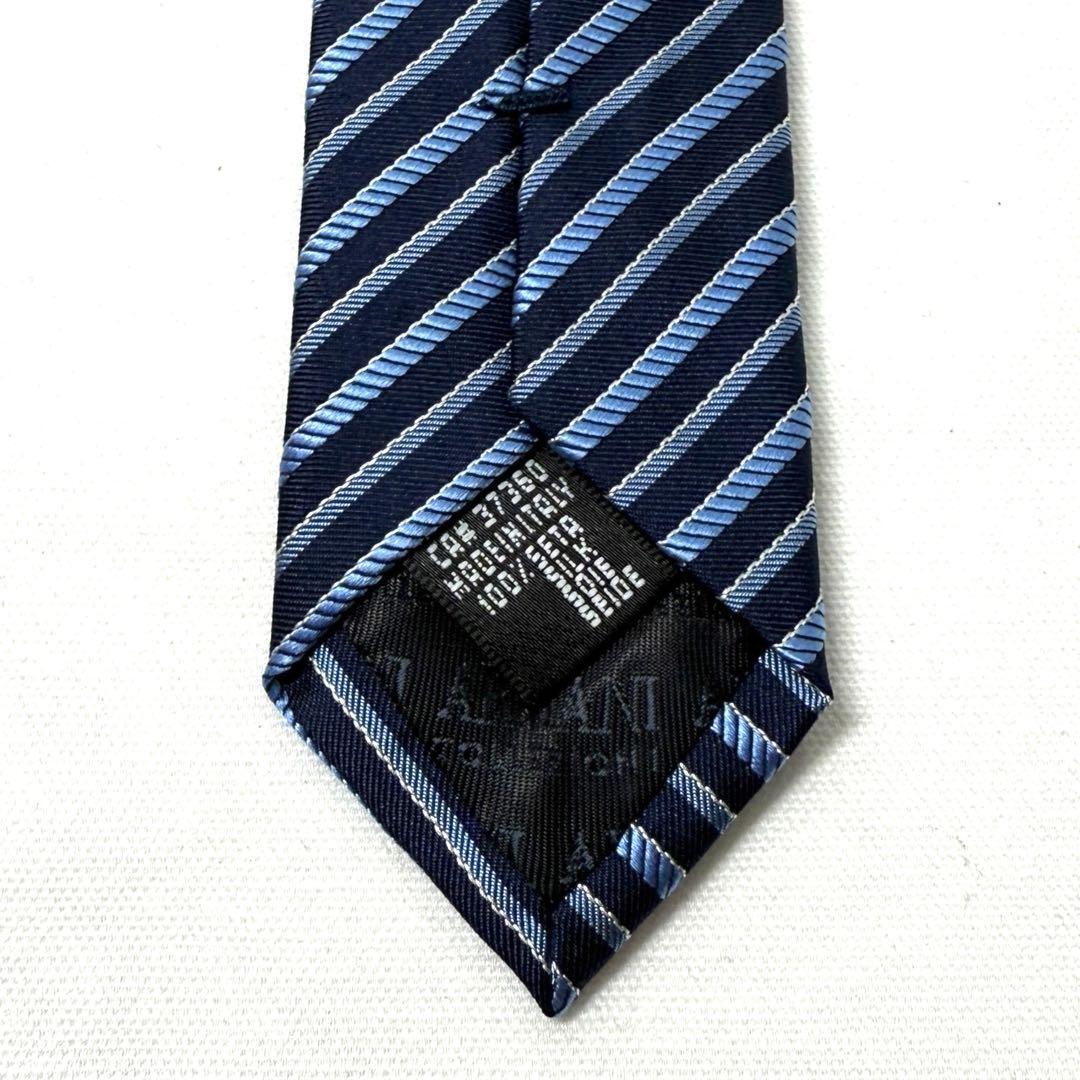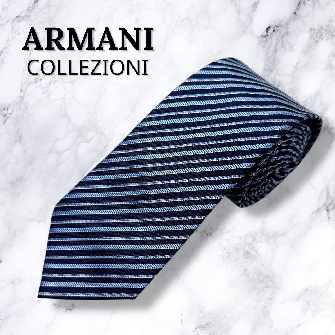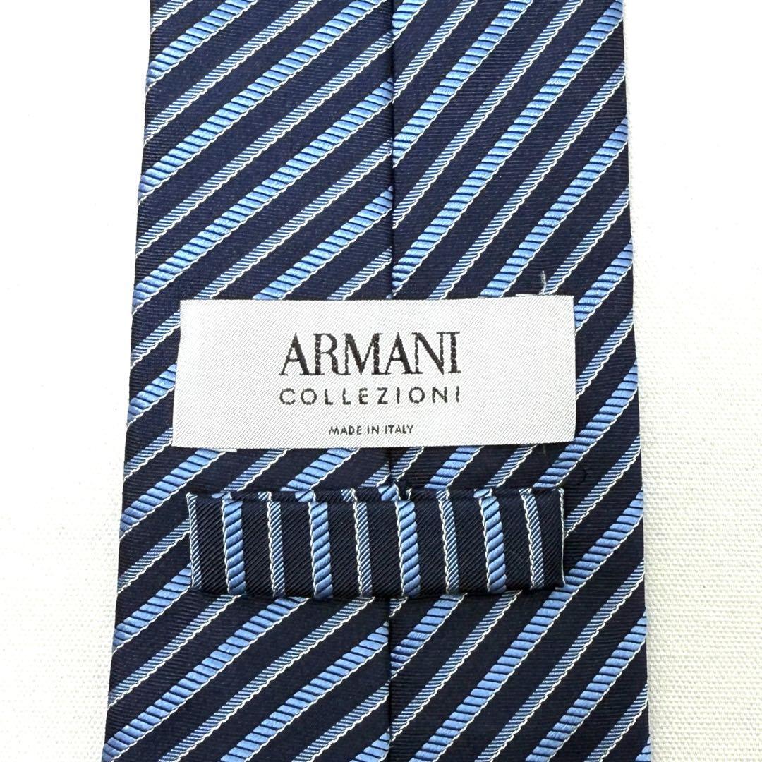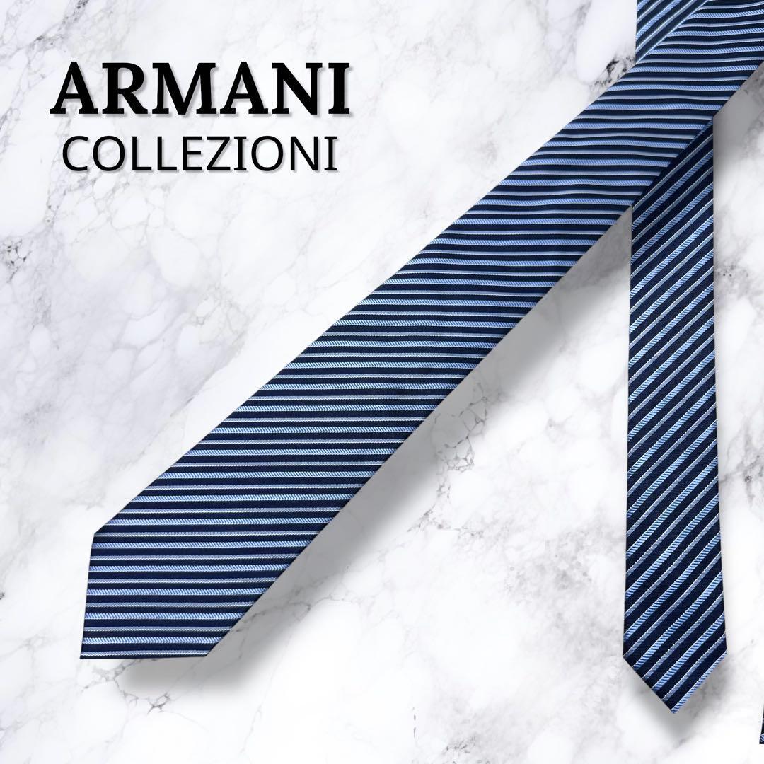 こちらはARMANI COLLEZIONI(アルマーニ コレッツォーニ)の上品なネイビー×ライトブルーのストライプネクタイです。