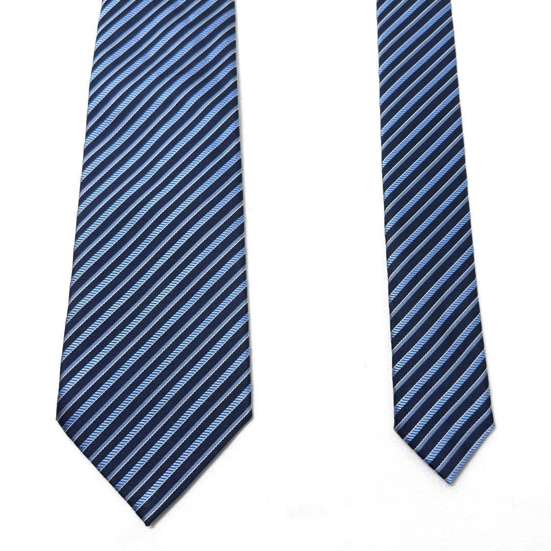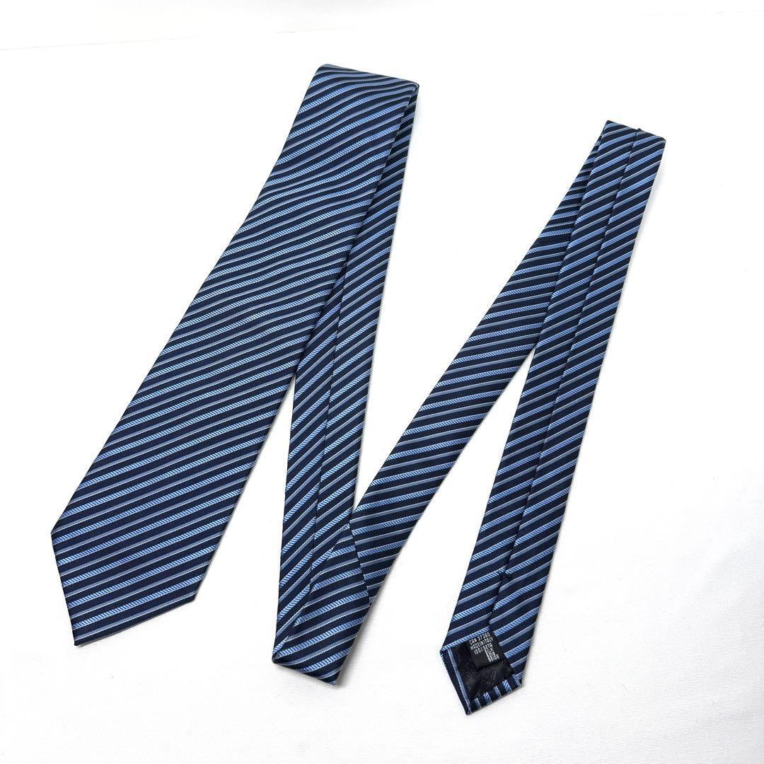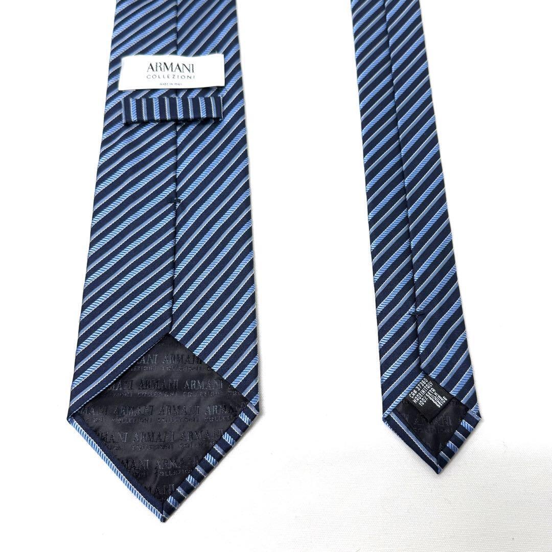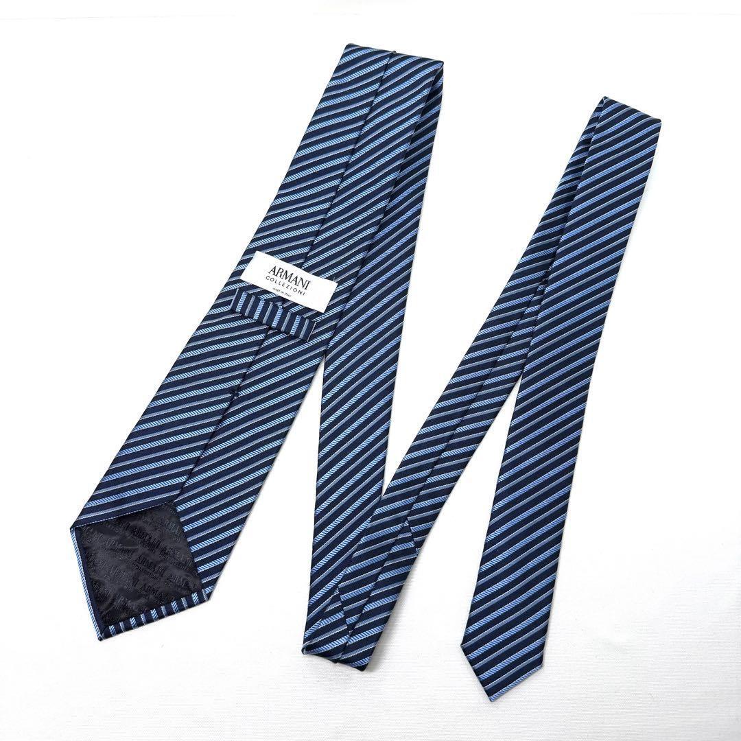 こちらはARMANI COLLEZIONI(アルマーニ コレッツォーニ)の上品なネイビー×ライトブルーのストライプネクタイです。