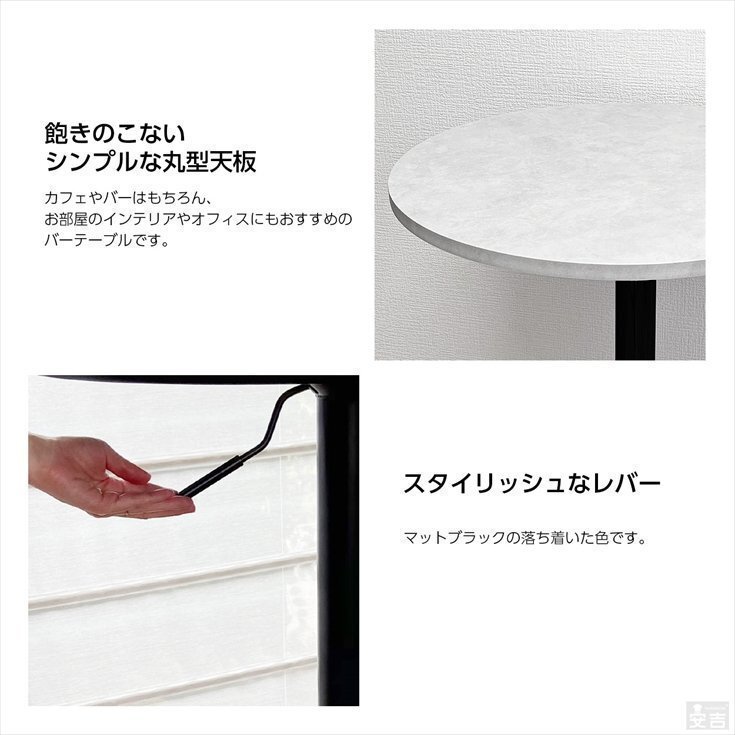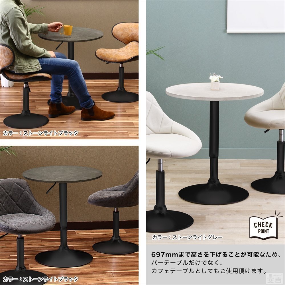 | カラー | ストーンライトグレー | 特長 | ・テーブルは360度回転します。 ※天板の固定は出来ません。 ・テーブル下のレバーで高さを調整できます。 ・バーやカフェのテーブル、休憩室や喫煙室のテーブルにも最適です。 ・昇降式なので座ってでも立ってでも利用できるテーブルです。 |