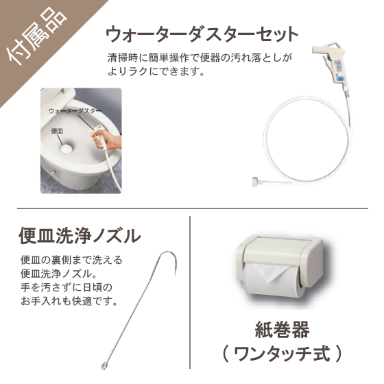 ・ 部分的な汚れや小便時には、付属のウォーターダスターで十分に汚れが落とせ、より効果的な節水が行えます。