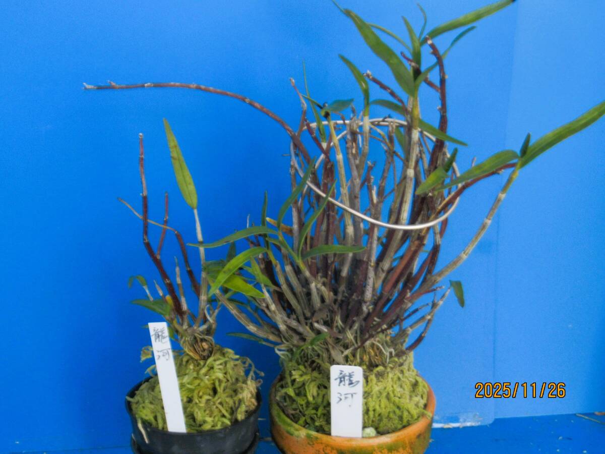 商品は四国産八重咲セッコク【龍 河】の株分け余剰株です。写真1は花見本、写真2の左が出品物、右は親株種木品、写真3が出品物の拡大写真です。余剰苗ですので激安から出品します。