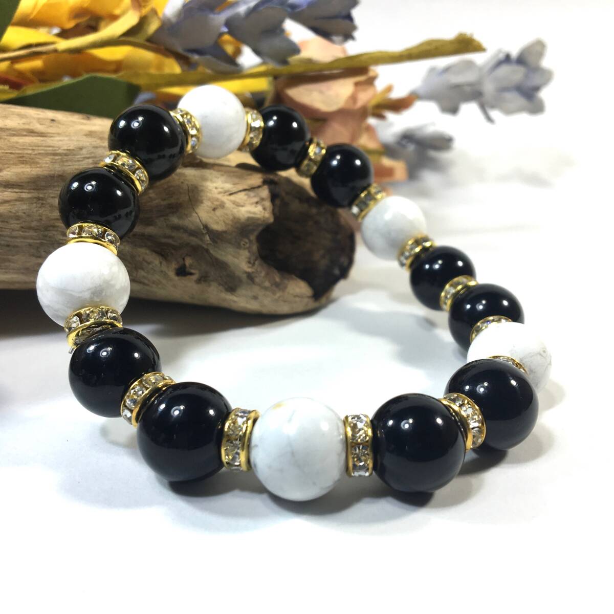 こちらは、オニキスとハウライトを組み合わせたパワーストーンブレスレットです。間にはロンデルを挟み高級感あるデザインに仕上げております。石大きさは12mm玉を使用して内径約18cmです。気になる方は是非この機会にどうぞ。