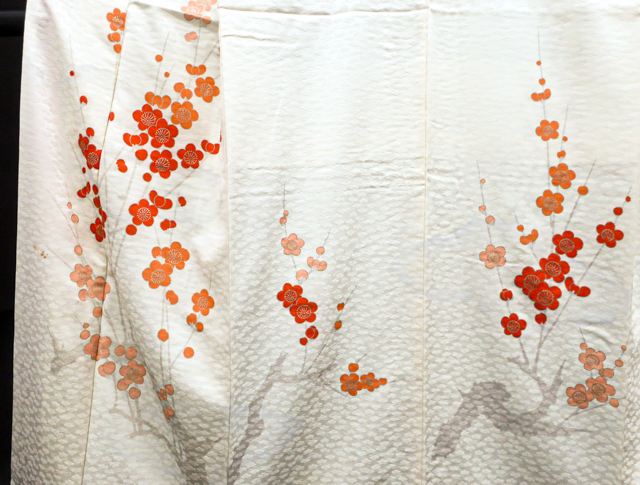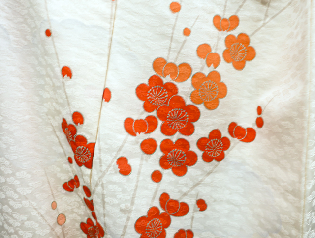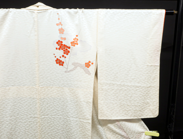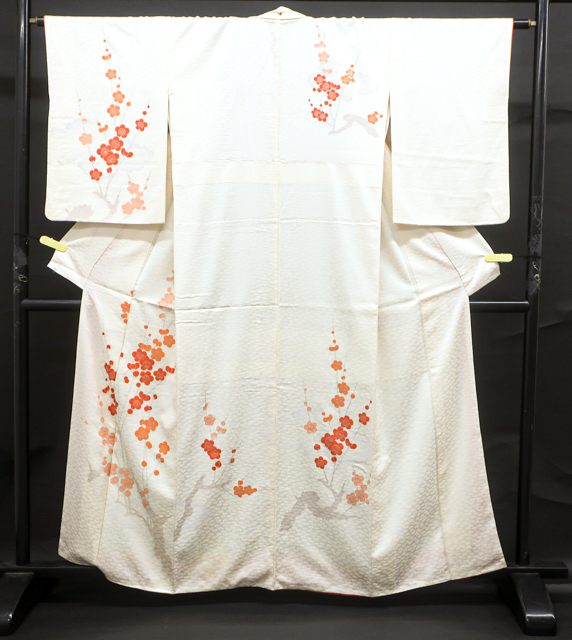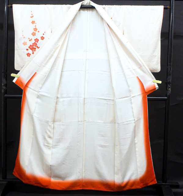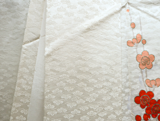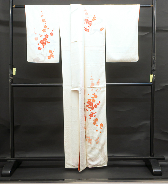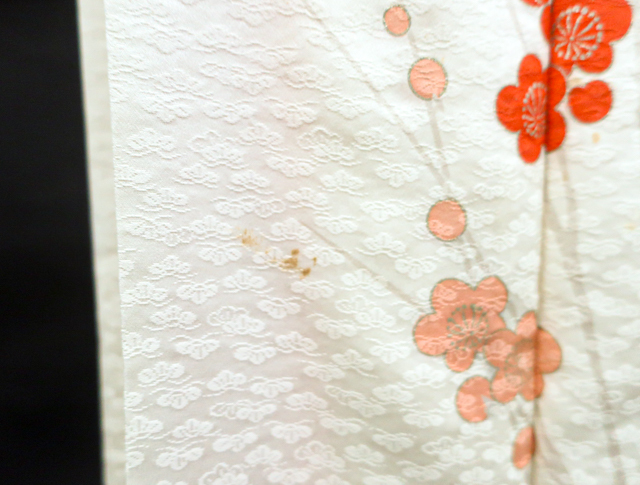 リサイクル商品のため、g左前衽、身頃、右後身頃の裾に汚れがございます。 また、右袖に点汚れがございますが着用可能なお品です。 地色は、アイボリーです。 1枚目の画像が近いお色かと思われます。 素材は正絹です。 |