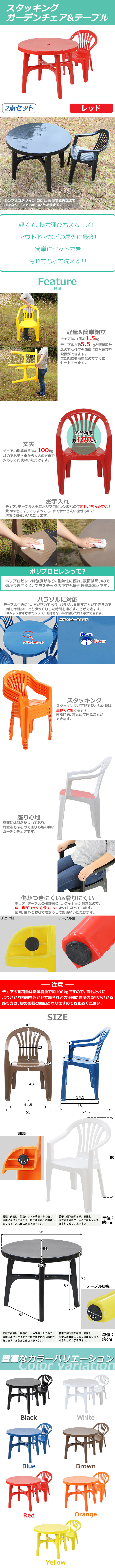 ●ガーデンチェアは、スタッキング構造なので重ねる事が可能なので、収納やまとめて運ぶ際にも大変便利です。 ●テーブル中央にパラソルなど、設置可能な穴があります。 ●テーブルは、簡単な組み立て式になります。チェアは、完成品です。 ●チェアは1脚約1.5kg、テーブルは約5.5kgと軽量なので、女性でも軽々持ち運べます。 ●材質は、軽量、安全、防水のポリプロピレン(PP)です。 注意! 背もたれによりかかり前脚を浮かせて座るなどの後脚に過度の負担がかかる座り方は脚の破損の原因となりますのでお止めください。 ■重量(チェア):約1.5kg ■耐荷重(チェア):約100kg ■重量(テーブル):約5.5kg ■耐荷重(テーブル):約100kg ■材質:PP[ポリプロピレン](チェア、テーブル)、ゴム(チェア脚裏)、PVC(テーブル脚裏) ●商品のカラーはレッドとなります。 ●新品商品ではありますが、輸入商品の為、多少の擦り傷などがある場合がございますので、ご納得の上ご購入下さいませ。 ●ご購入後、お客様ご都合によるご返品、ご返金等は一切お受け致しておりません。 ●本商品を使用した際に発生したトラブル、事故につきまして、当社は一切の責任を負いません。ご使用に関しましては、全て自己責任にてお願い致します。 |