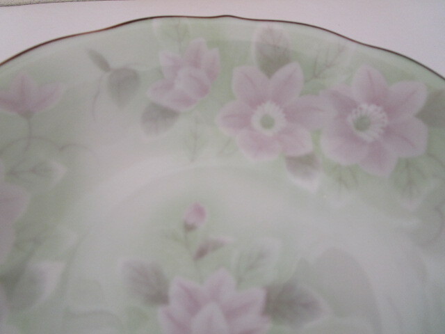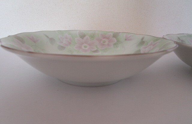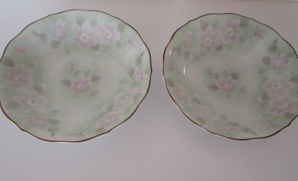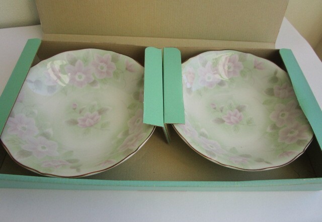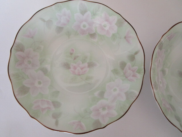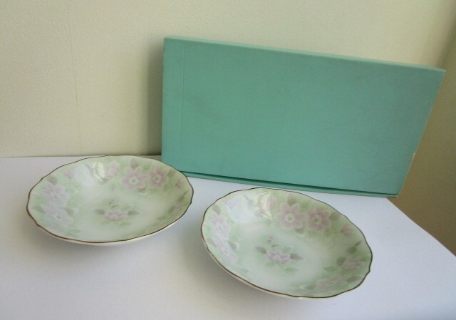 未使用 昭和レトロ 尭峰 深皿 直径16.5㎝ 2枚セット 花柄 淡い色 緑のぼかし 和食器 優しい色 波ぶち