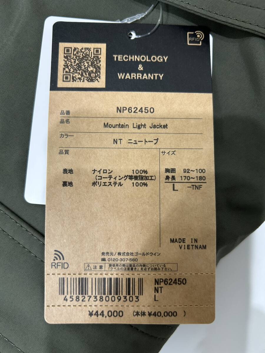 【未使用】THE NORTH FACE ノースフェイス マウンテン ライトジャケット NTニュートープ NP62450 Lサイズ【護12】