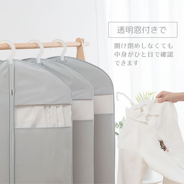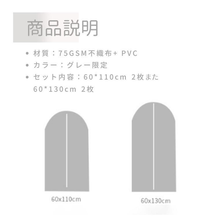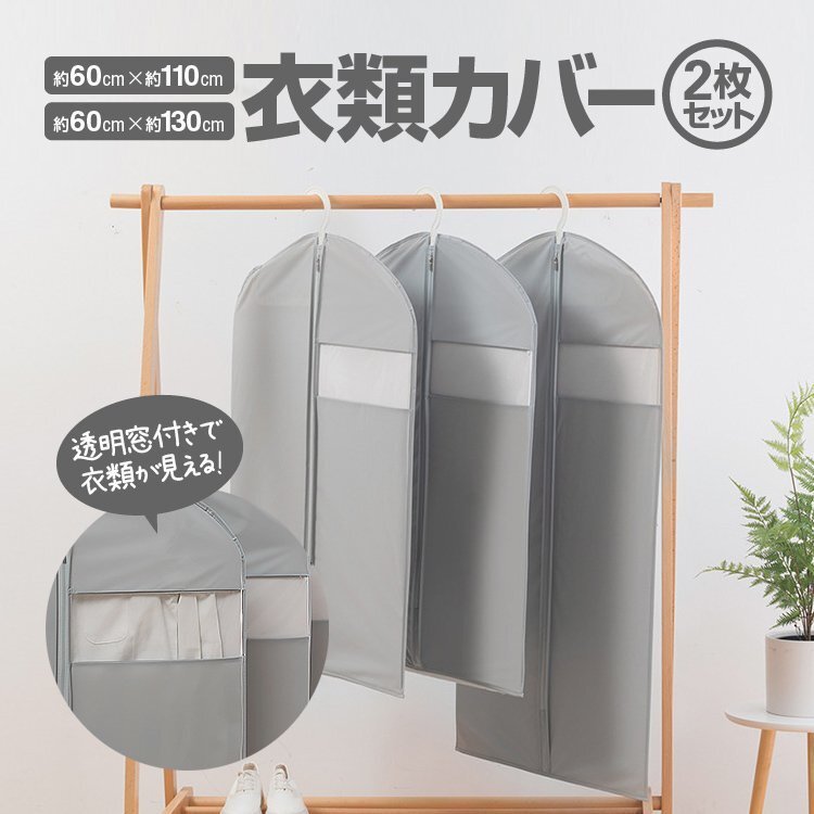 ◆洋服カバー 衣類カバー 不織布 防虫 透明窓付き 型崩れ防止 防塵 防湿 防カビ 収納用品 金属ファスナー 皺がないよう 洋服長期保管に 通気性 2枚セット グレー SUMI1113S2/130cm