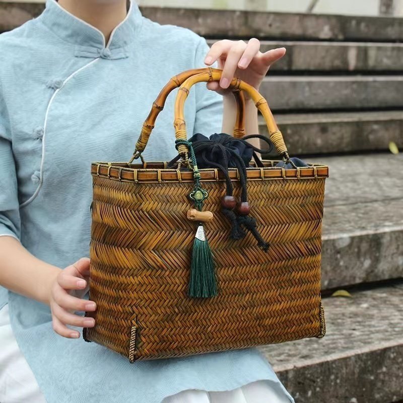 高級感満載!バスケット 収納かご おしゃれ竹籠 編み 取っ手 持ち手  手作りトートバスケット 持ち手 自然の良品