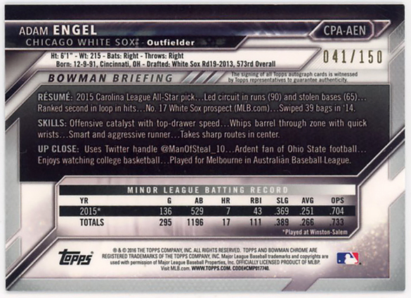 WHITESOX△ADAM ENGEL/2016 BOWMAN CHROME直書サインPROS #150 ブルーリフ版!