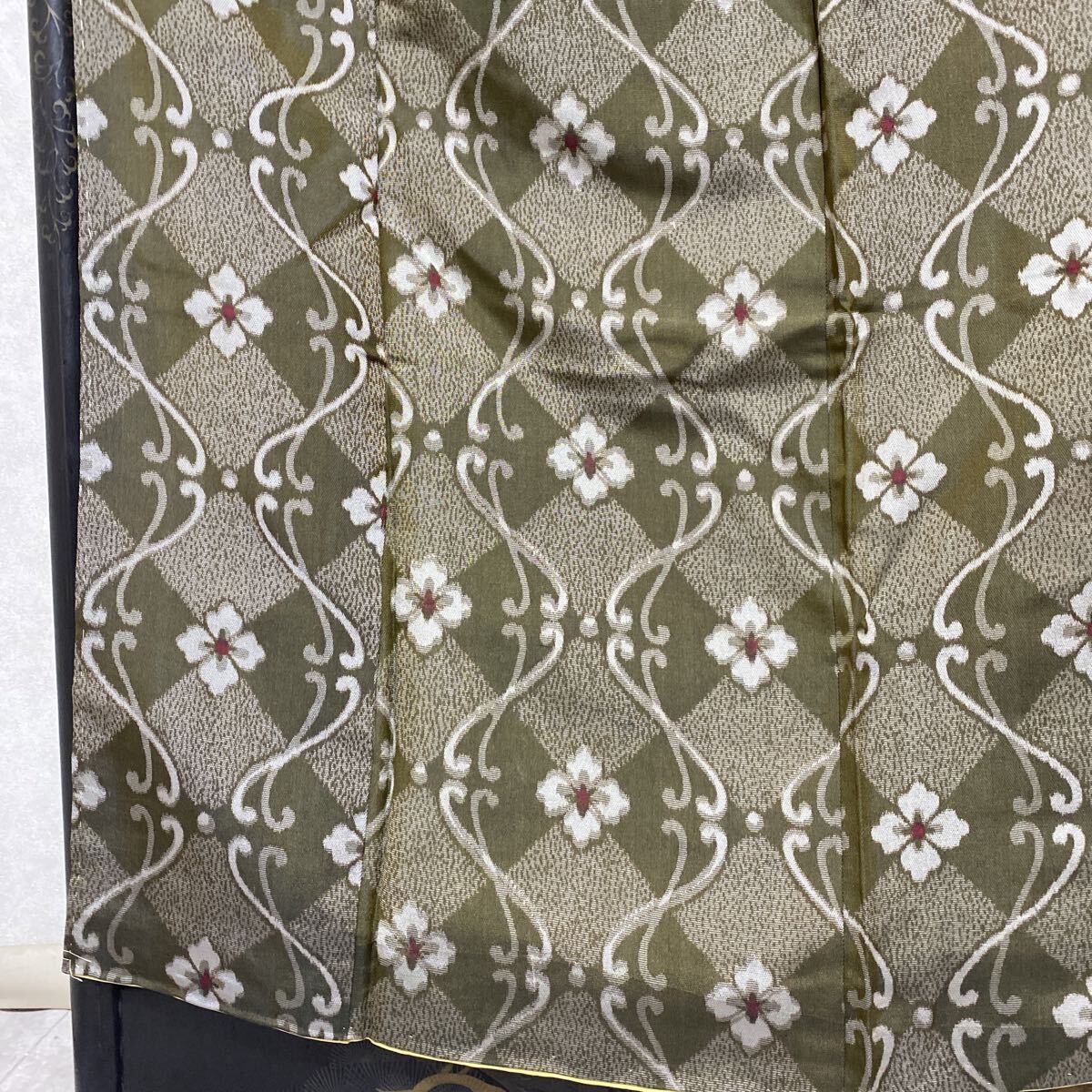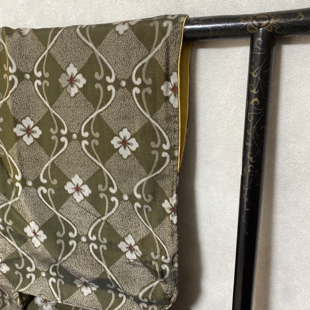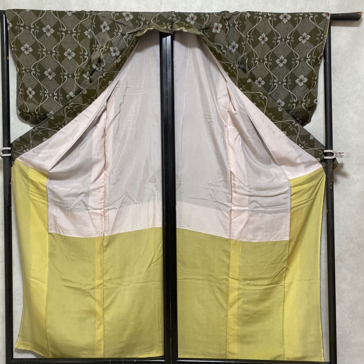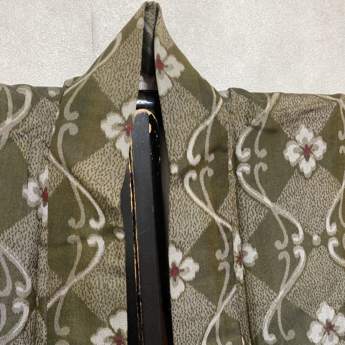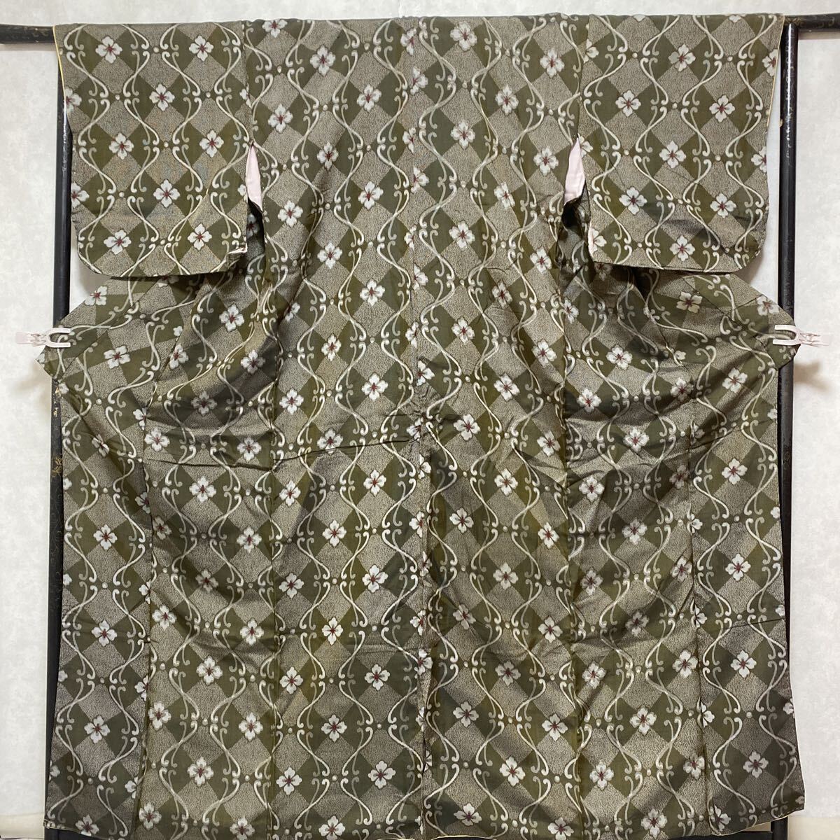 アンティーク 着物 正絹 菱形 唐草 花 カーキ バチ襟 昭和レトロ 大正ロマン モダン 和洋折衷コーデ リメイク 25さ25-7s