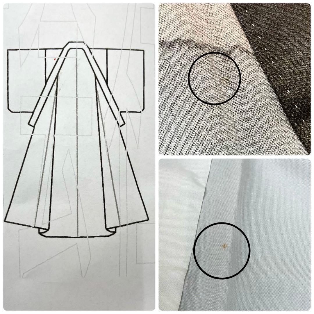 写真9枚目 イラスト◯印部分衿あたり表裏にうっすらシミがあります。