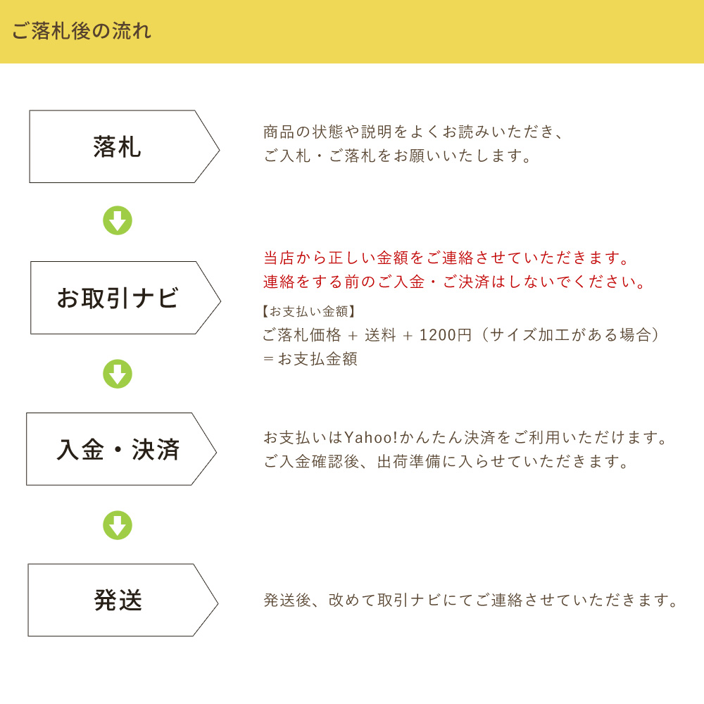 Yahoo!かんたん決済(詳細) ご落札後、取引ナビにて総額をお知らせ致します。 こちらからの連絡前にご入金、ご決済はしないようにお願いいたします。 |