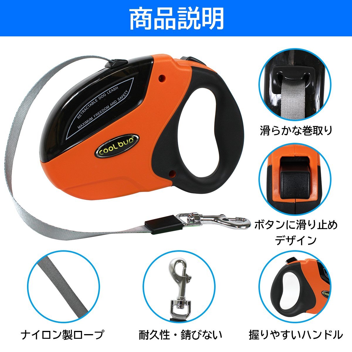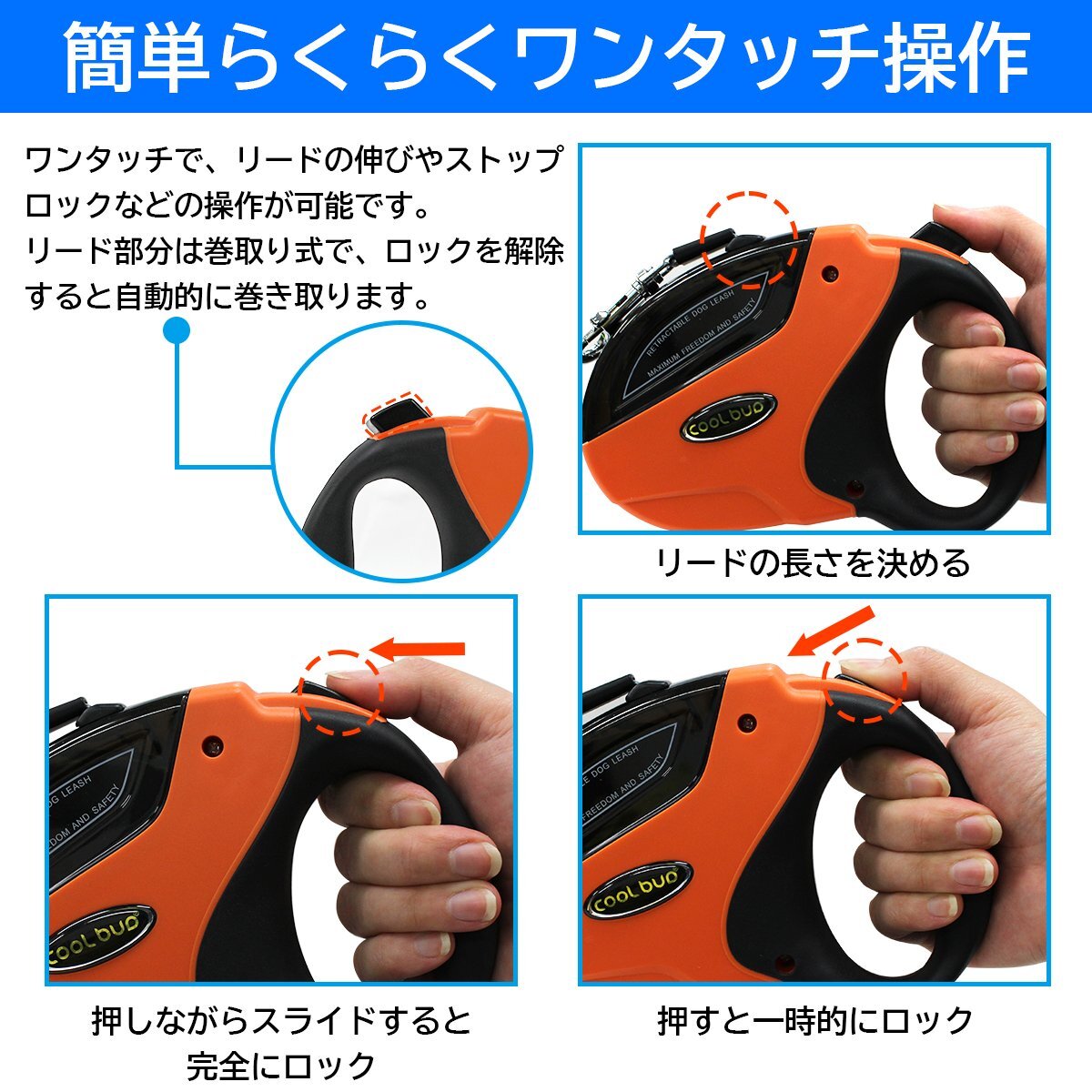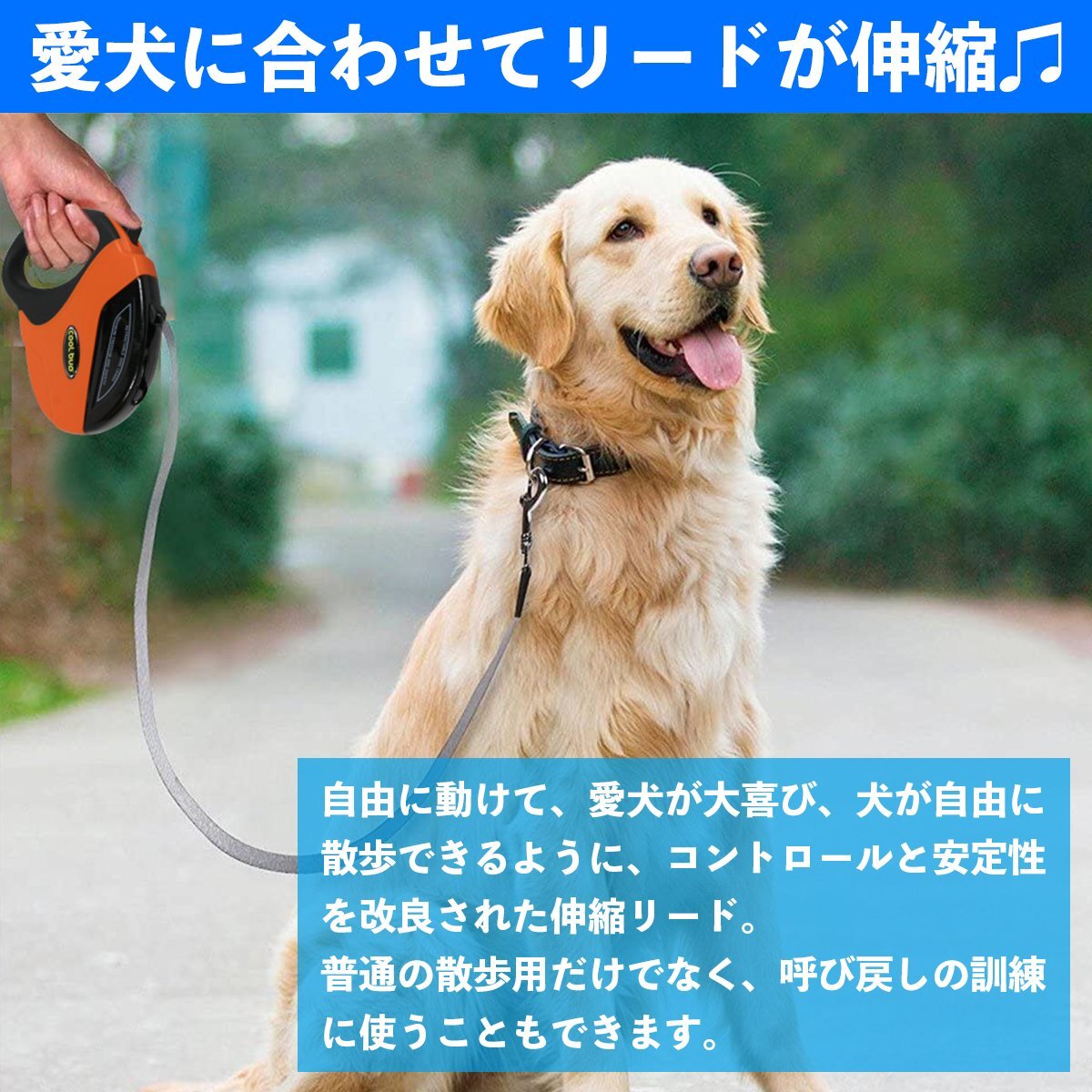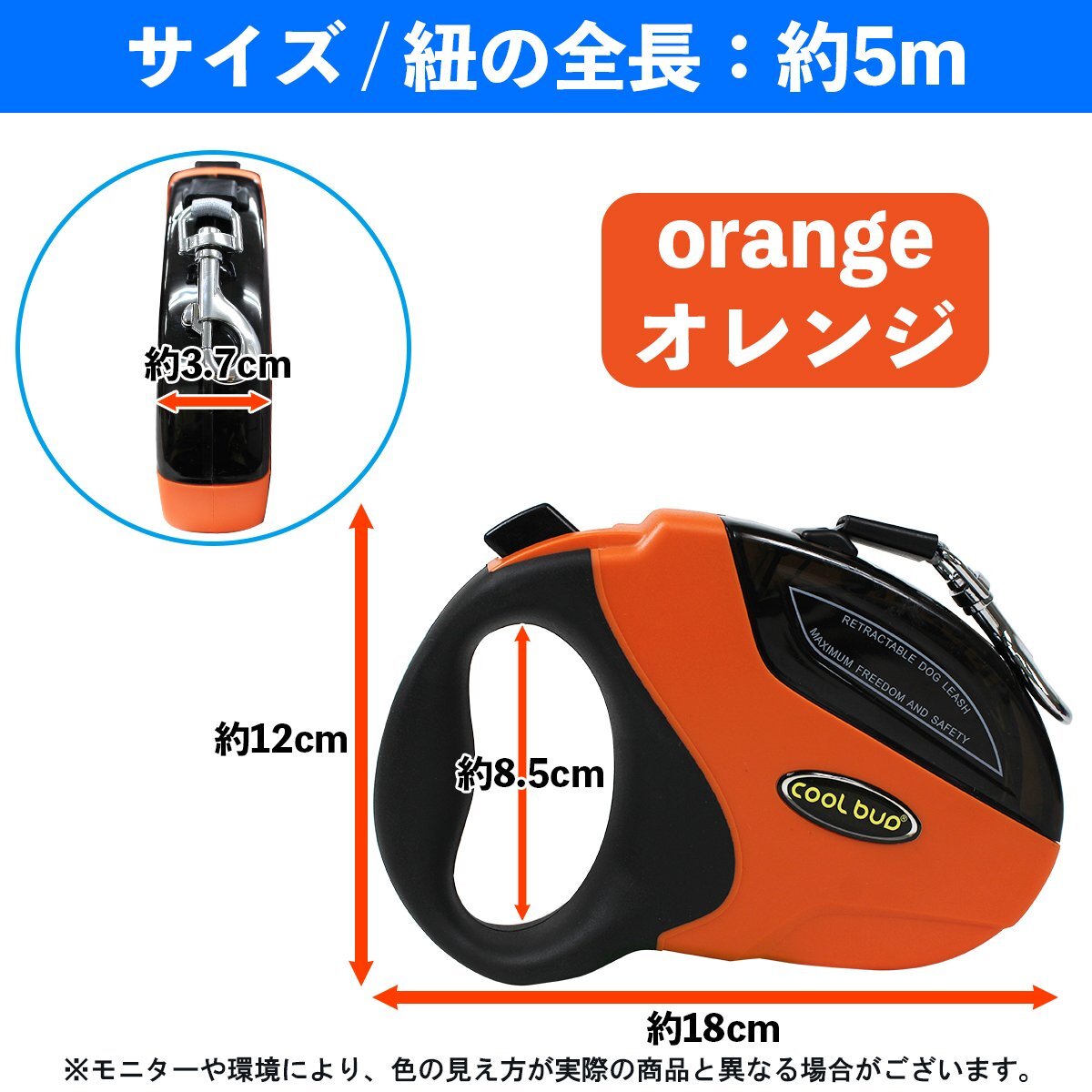 便利なロック機能付き!犬用 伸縮 リード 5m/5メートル 自動巻き取り オレンジ 橙 ペット 散歩 小型犬 中型犬 犬 ヒモ