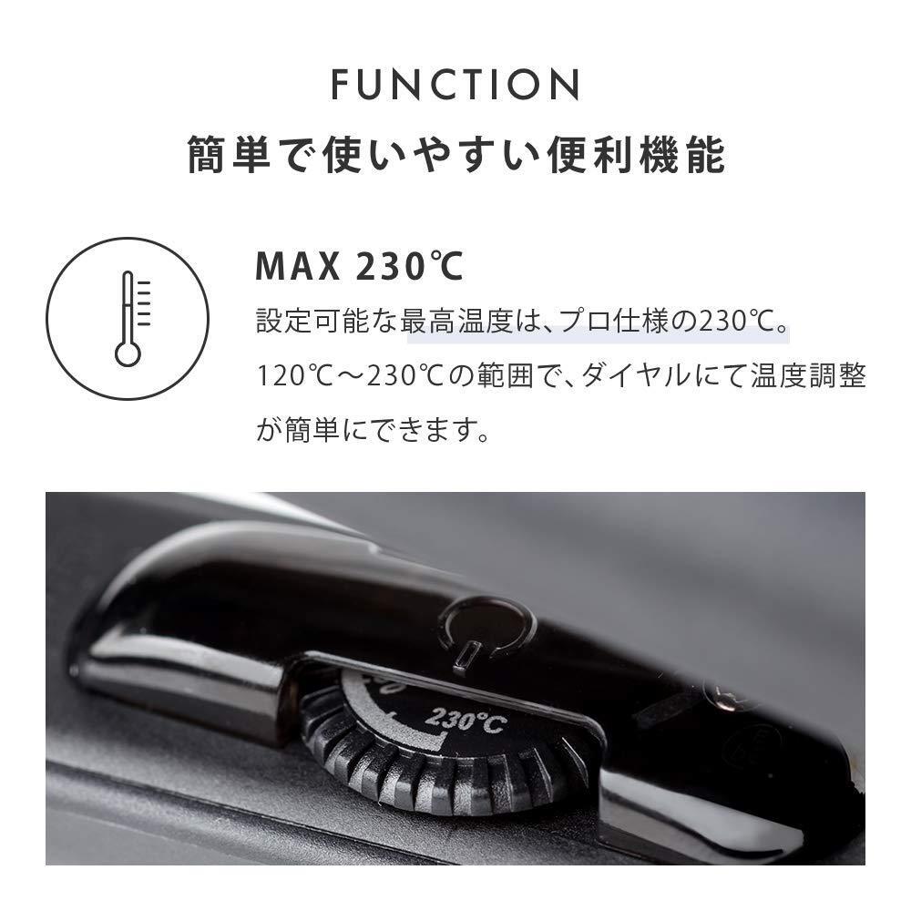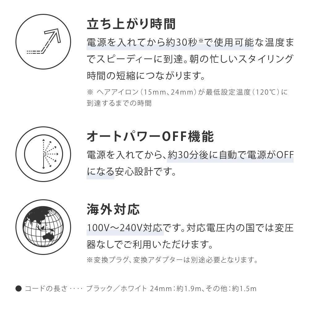 -仕様-【型番】SL-004SGR 24mm【電源】 AC100V?240V 50/60Hz【プレートサイズ】 24×92mm【設定温度】 120℃?230℃【定格消費電力】 40W【コード長】 約1.5m-使用上の注意-・使用の際は、同じ箇所に長時間当て続けないようにしてください。髪を傷める原因となります。・過度に濡れた髪には使用しないでください。やけど・髪を傷める原因となります。・使用後はプレート部分や本体が大変高温です。直接触れたりしないでください。やけどの原因となります。・180℃以上で使用の場合、髪質によっては焦げたり煙が出たりすることがあります。その場合は温度を下げて使用してください。・使用後は電源がOFFになっていることを確認し、必ずコンセントから電源プラグを抜いてください。※詳細は取扱説明書をご確認ください