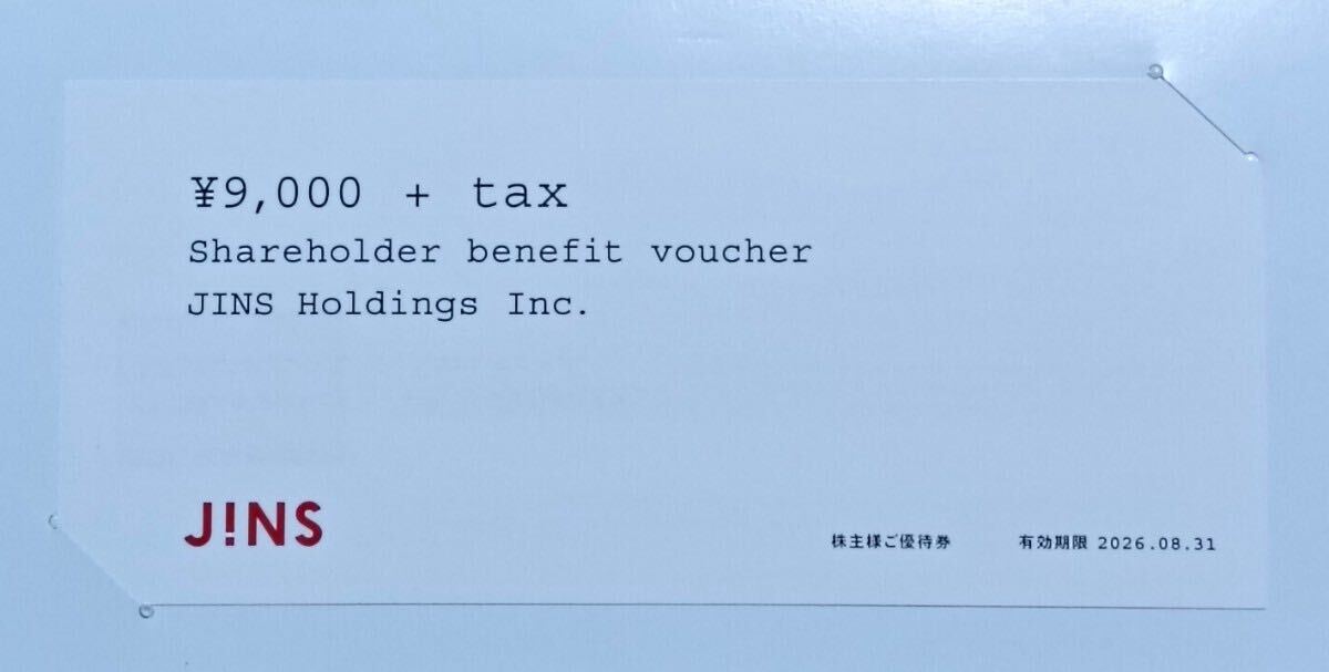 JINS ジンズホールディングズの株主優待券9,000円+税分1枚です。