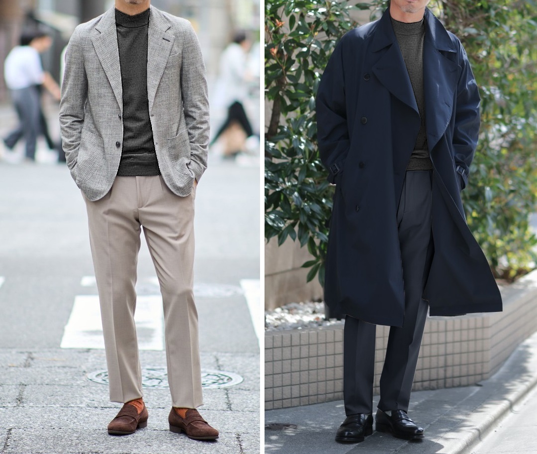 基本的にジャケットスタイルでは首元が開き過ぎるとカジュアル感が強まりますが、 首元が適度に詰まっているモックネックなら、スティーブ・ジョブズよろしくな知的なニュアンスをプラス。