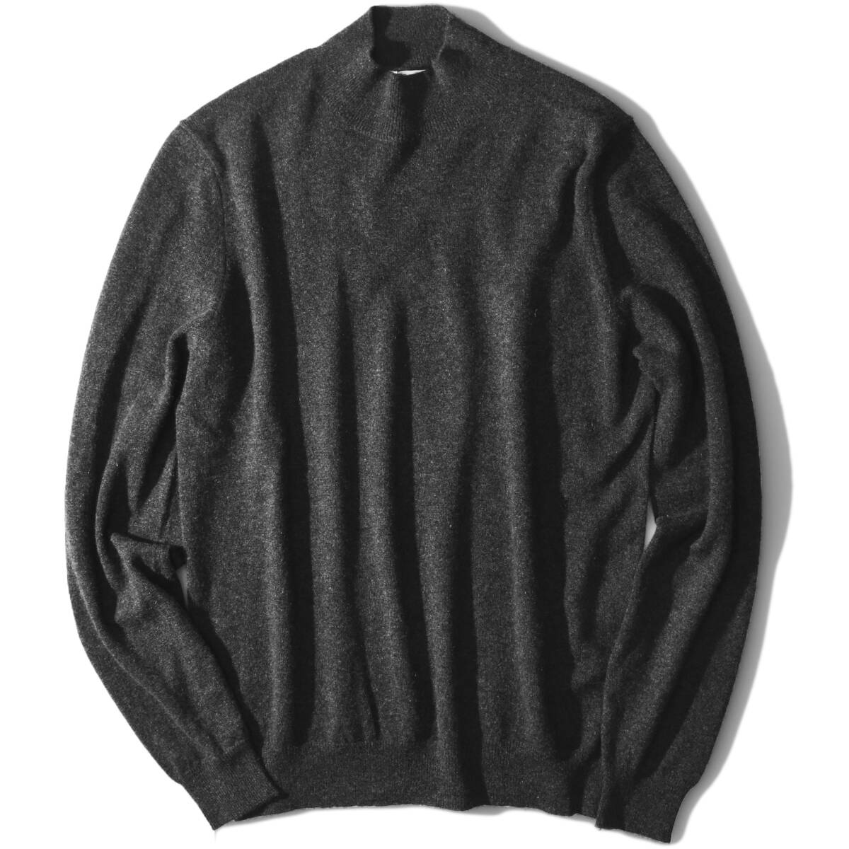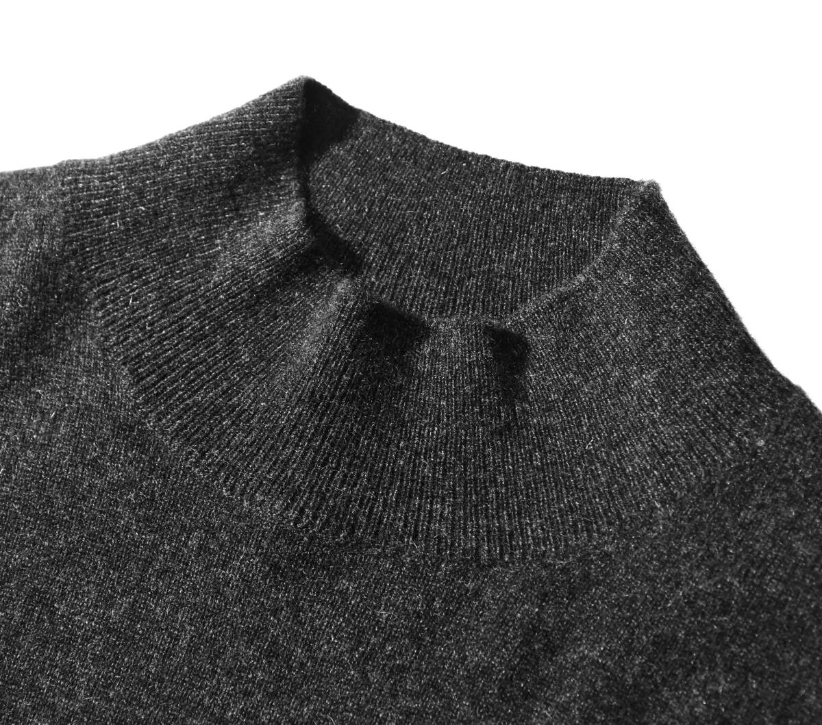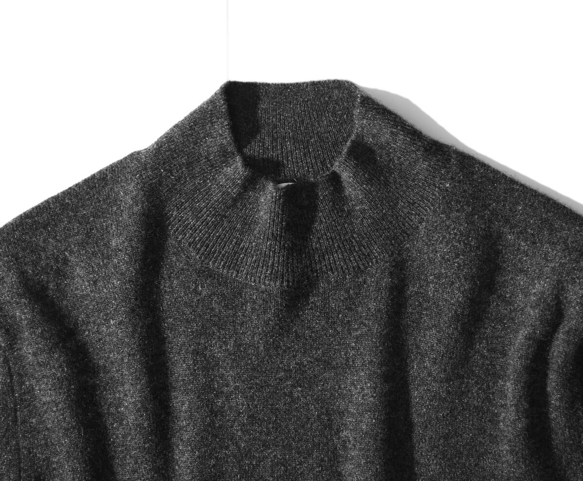 デザインは、このところタートルネックを凌ぐ勢いを見せているモックネックニットになります。 “モック”とは、偽の、みせかけの、という意味。タートルネックのように首を折り返さない、いわゆるハイネックのことです。 タートルネックと違って秋口から着用できることや、首の折り返しがないのでシンプルに見えることなどが人気の理由です。 タートルネックの首が詰まる感じや締め付け感が苦手という方にもお勧めです。
